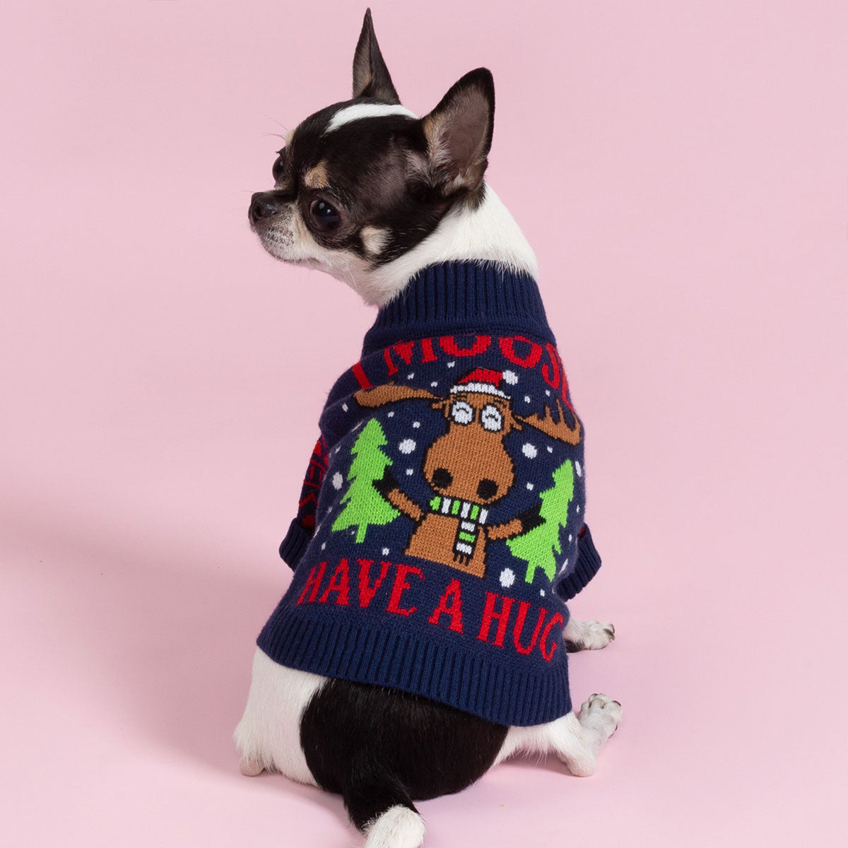 Navy blue dog sweater with "I Moose Have A Hug" lettering, featuring a moose graphic, Christmas trees, and snowflakes.