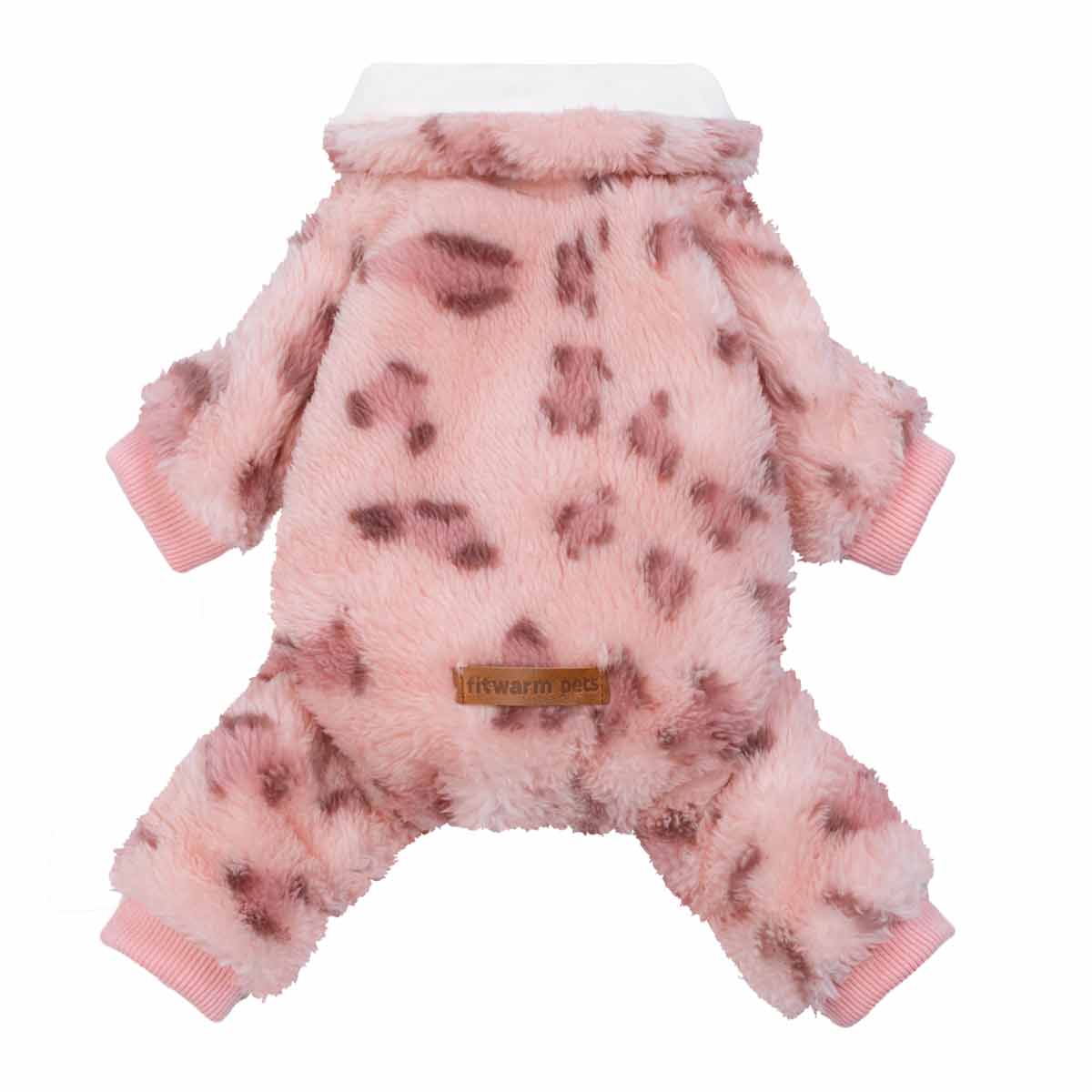 Pink fuzzy dog pajamas featuring a plush leopard-style print shown in a straight-on back view.