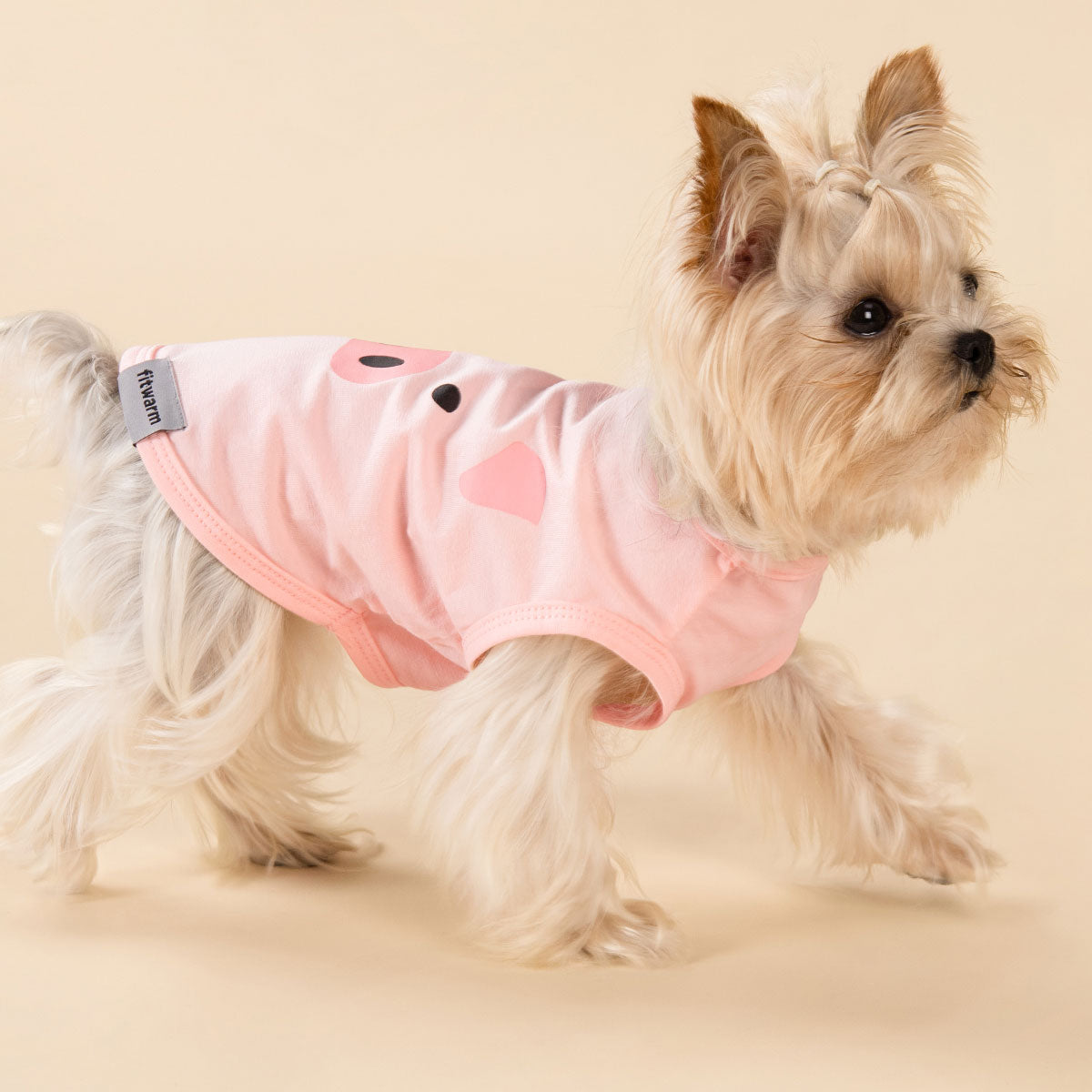 Yorkshire Terrier in pink pig face dog shirt from Fitwarm. Breathable and comfortable dog summer clothes.