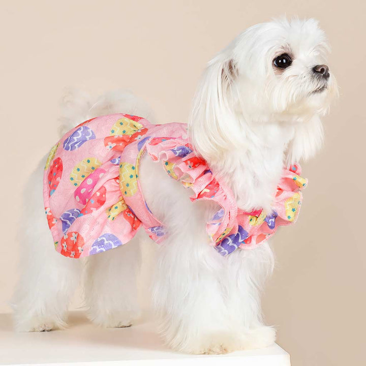 Pink Easter dog dress with colorful egg pattern and ruffle sleeves. Ideal dog Easter outfit for spring celebrations.