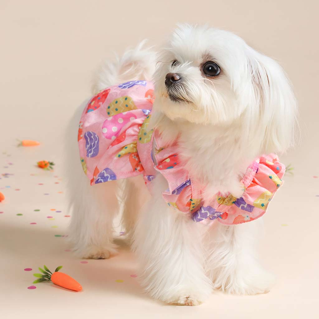 Easter dog dress with egg patterns, ruffle sleeves, made from soft, breathable fabric. Perfect dog Easter outfit.