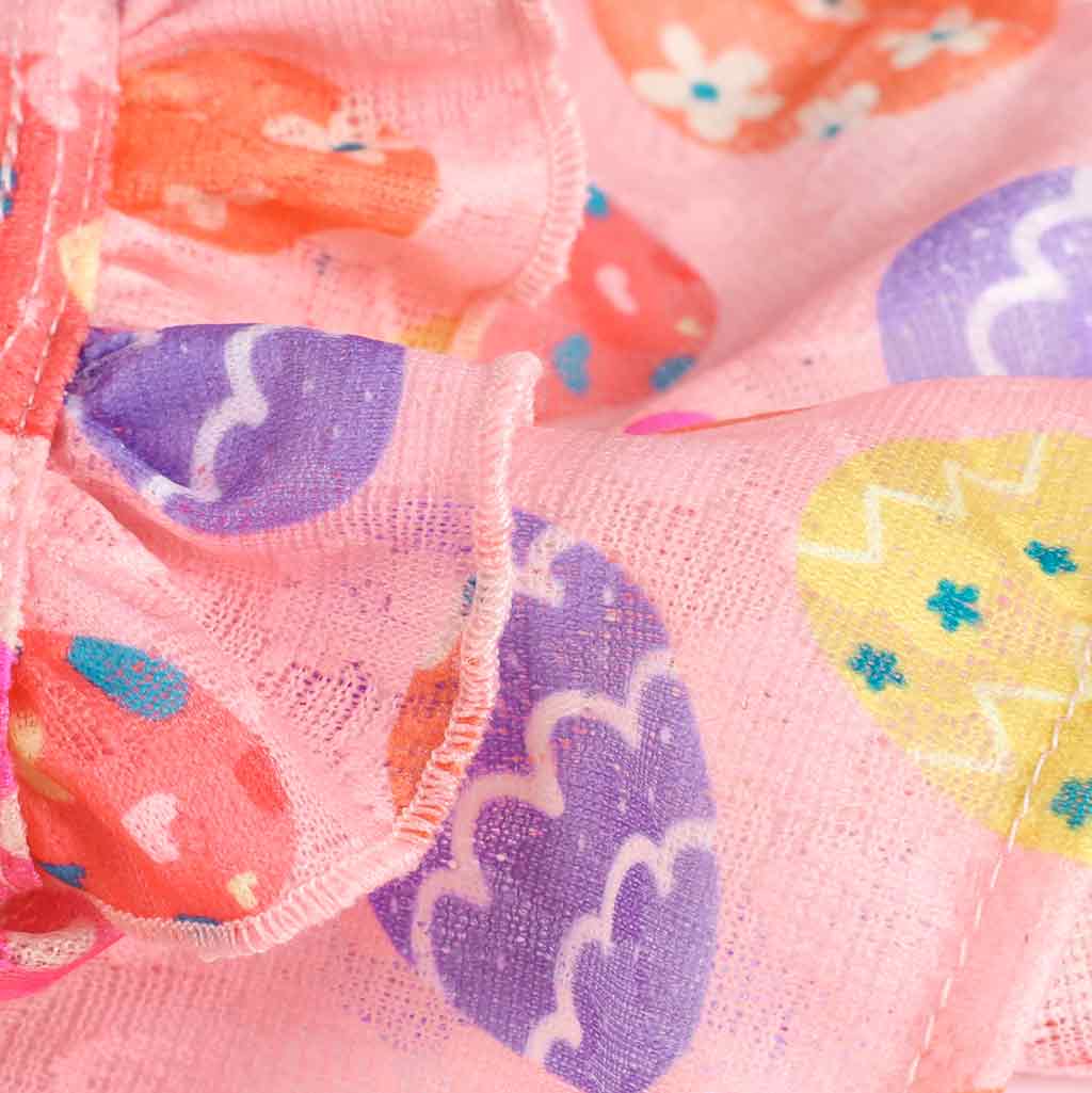 Close-up of pink Easter dog dress fabric with egg patterns and ruffle detail.