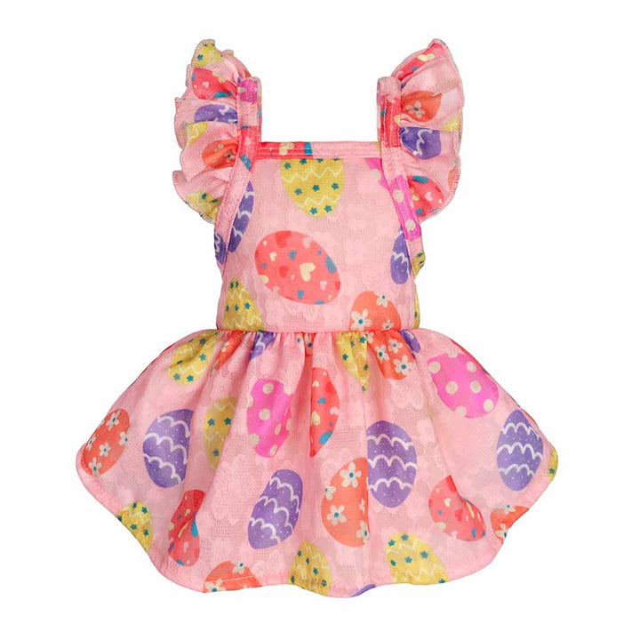 Pink dog Easter dress with colorful egg patterns and ruffle sleeves, perfect for Easter celebrations.