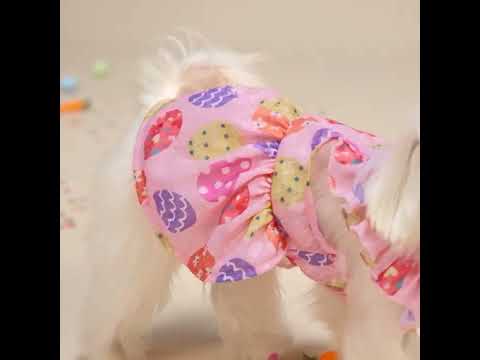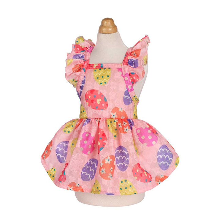 Easter dog dress with egg patterns and ruffle sleeves. Perfect for spring celebrations.