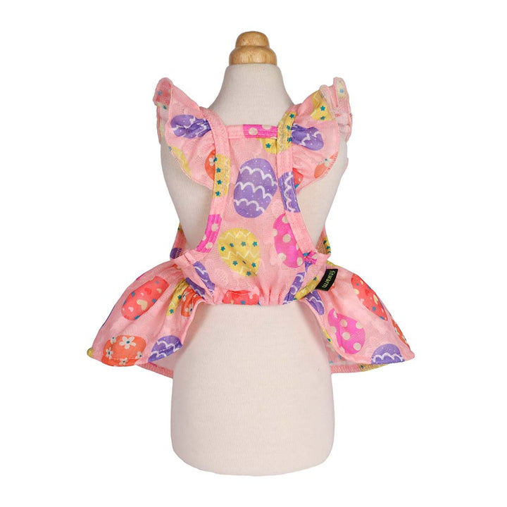 Pink Easter dog dress with colorful egg pattern and ruffle sleeves, ideal dog Easter outfit.