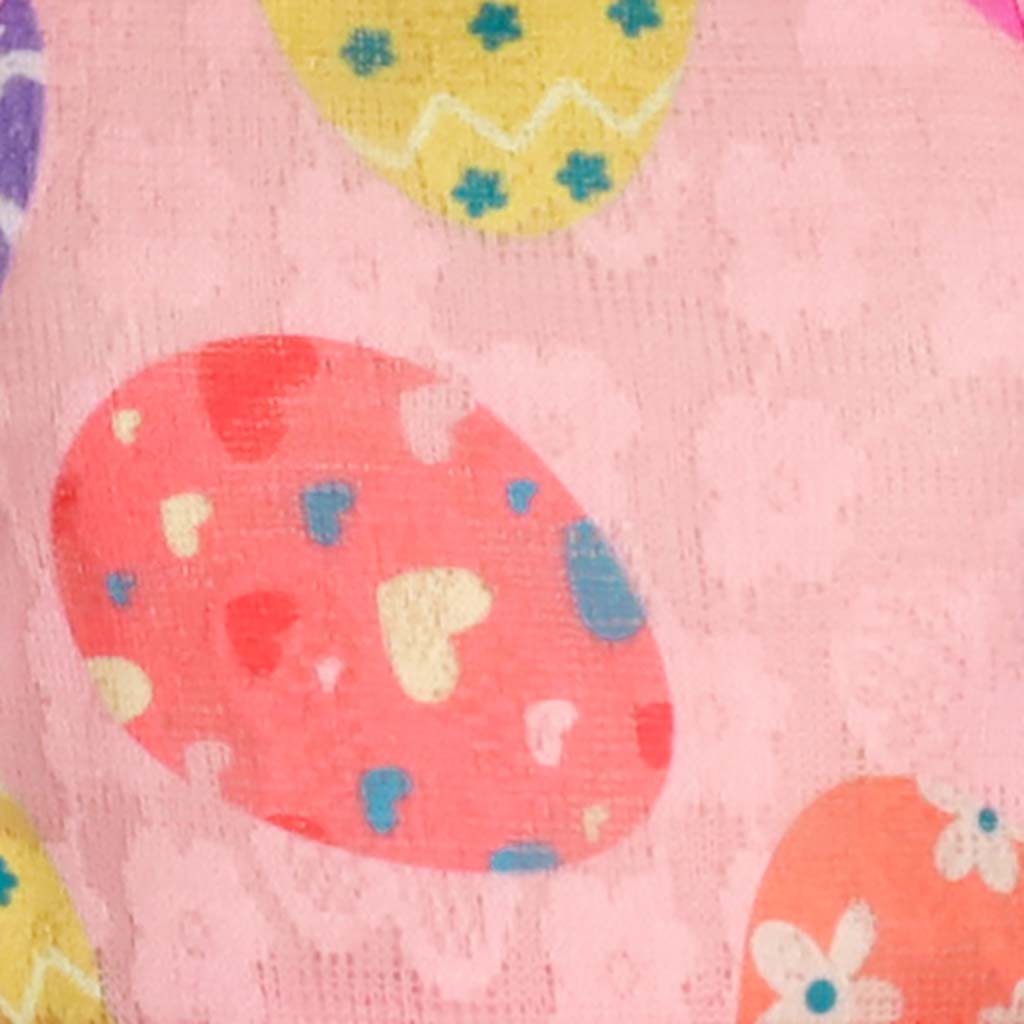 Close-up of pink dog Easter dress fabric with colorful egg patterns, perfect for spring celebrations.
