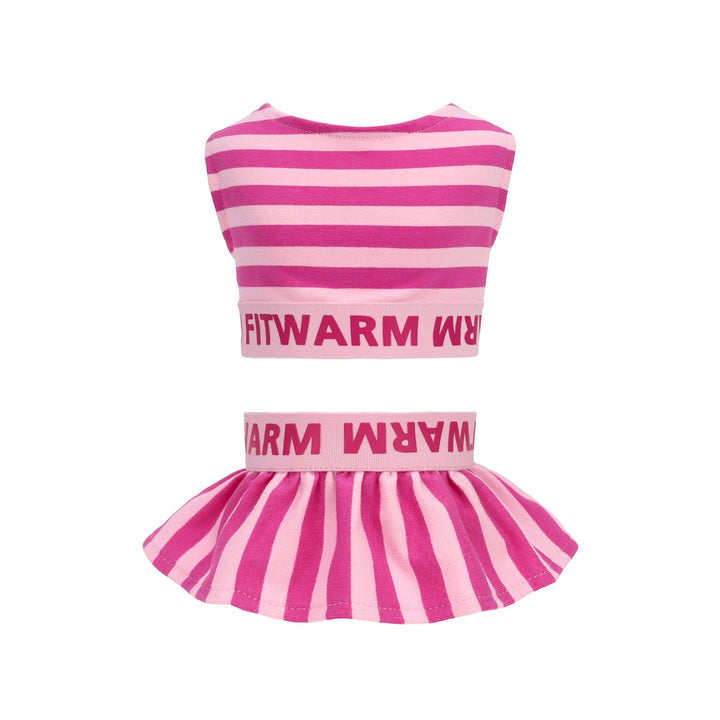 Pink striped dog crop top and skirt set with Fitwarm logo, athleisure outfit for small dogs