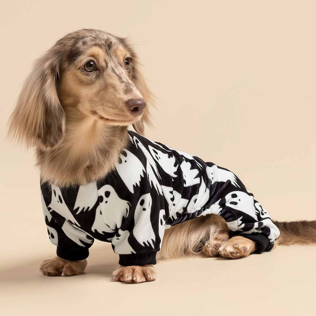 Long-haired dachshund in soft, black and white ghost print Halloween dog pajamas, featuring a four-leg cozy fit.