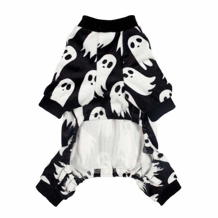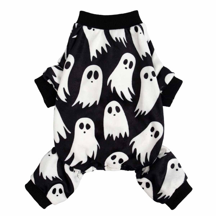 Cozy black dog pajamas with white ghost patterns, featuring a four-leg design and snug ribbed cuffs for Halloween.