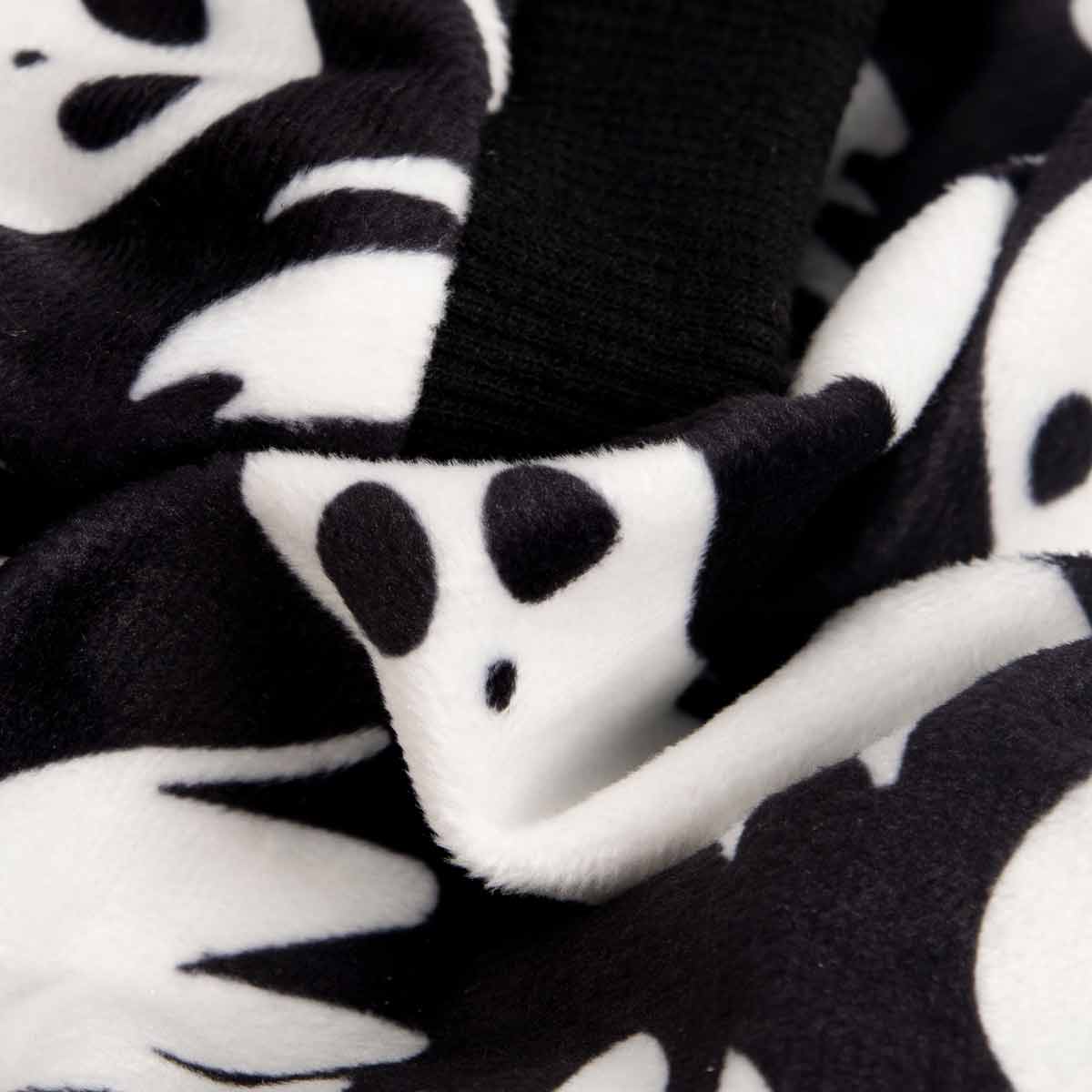 Soft black polyester fabric with white ghost print for Halloween dog pajamas, showcasing ribbed cuffs.
