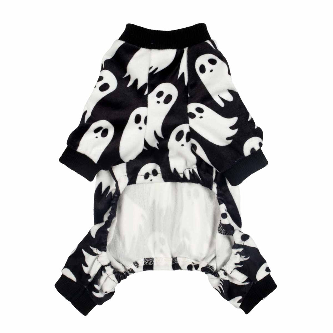 Black and white Halloween ghost dog pajamas, soft polyester blend, with four-leg design and ribbed cuffs for cozy pet wear.