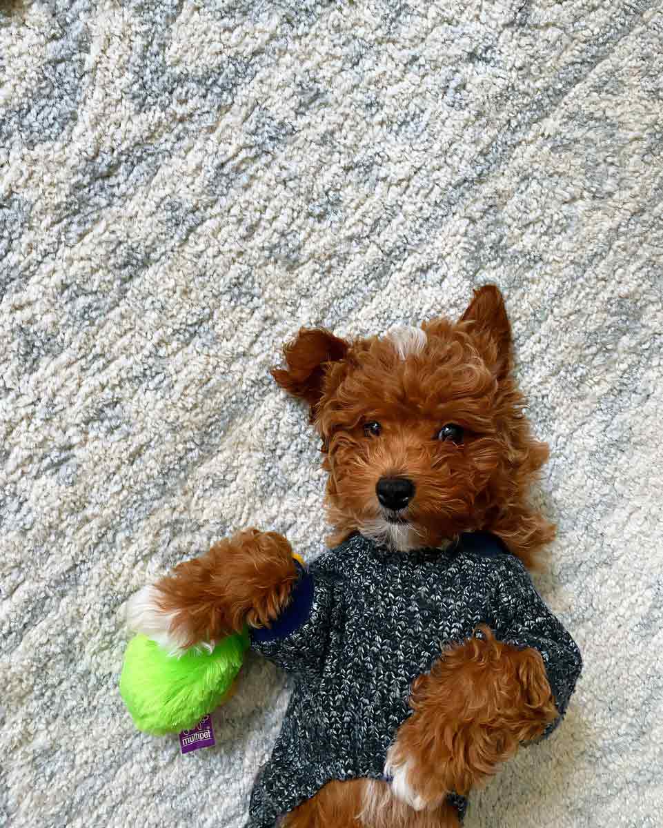 Brown poodle puppy wearing a dark gray knitted sweater, holding a neon green toy.