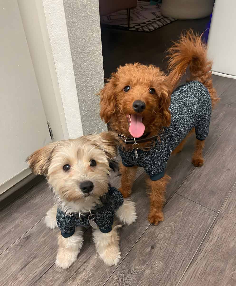 Two dogs wearing dark grey thermal knitted pajamas. Cozy and stylish dog apparel for comfort and warmth.