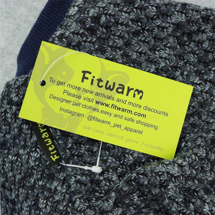 Grey knitted dog sweater with dark blue ribbed collar and cuffs, packaged in plastic with Fitwarm branding.