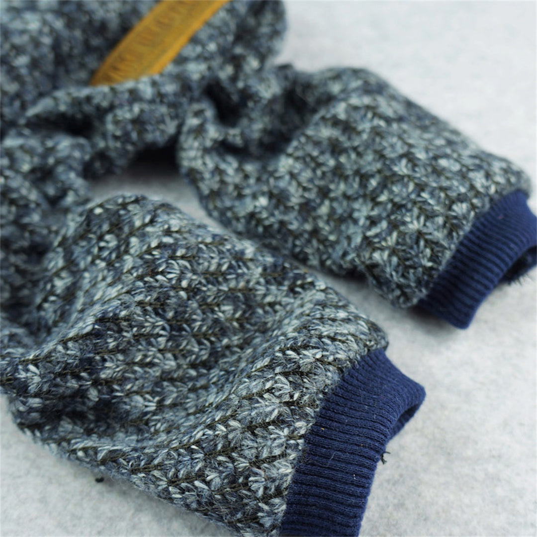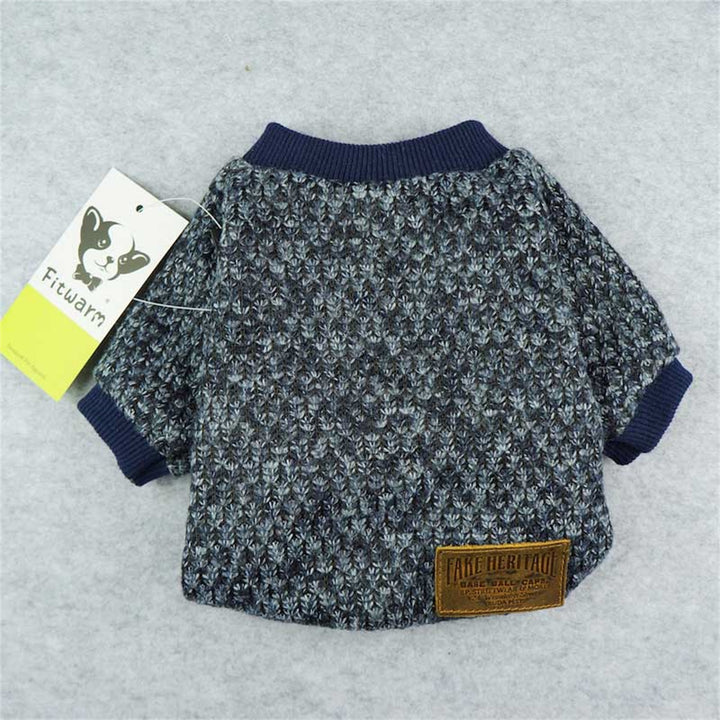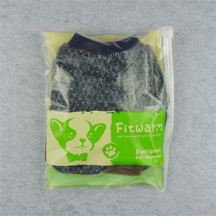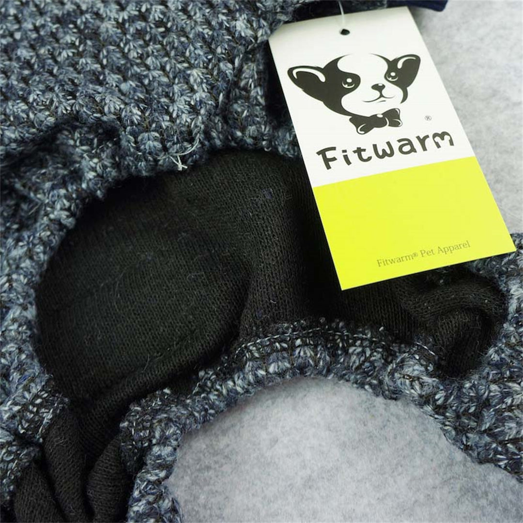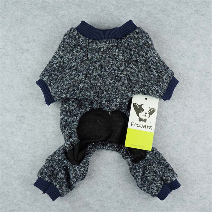 Gray knitted dog pajamas with navy blue trim and a Fitwarm tag.