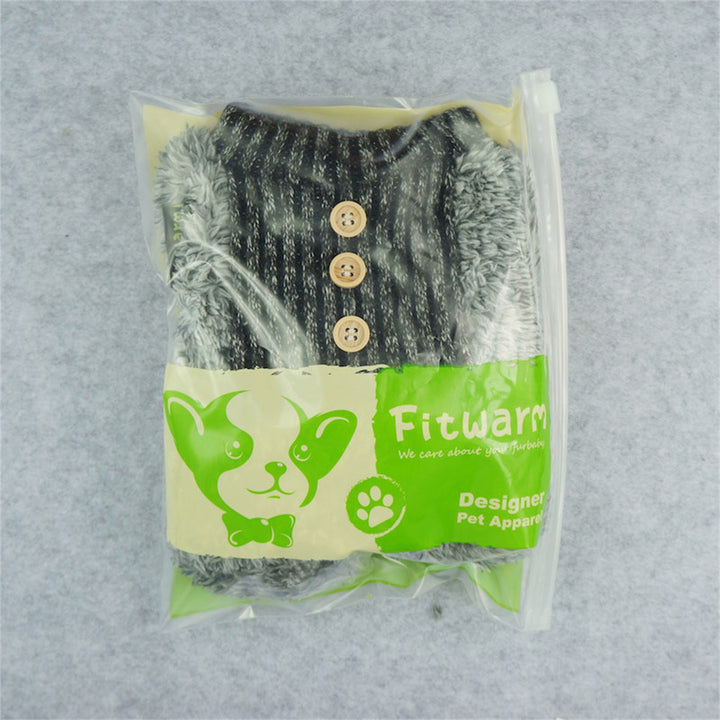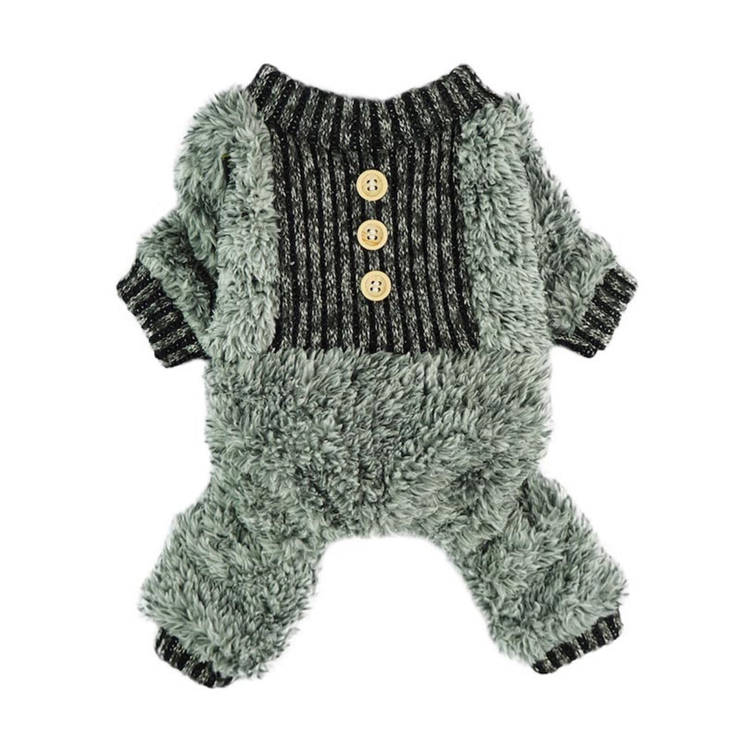 Gray fluffy dog pajamas with black and white striped knitted chest and wooden buttons.