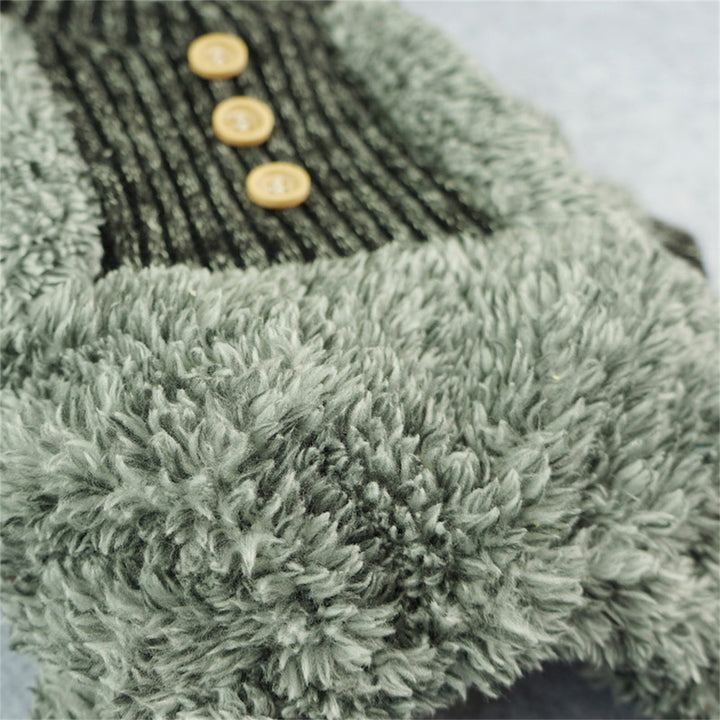 Close-up of grey fuzzy thermal dog pajamas with three wooden buttons on a dark ribbed knit.