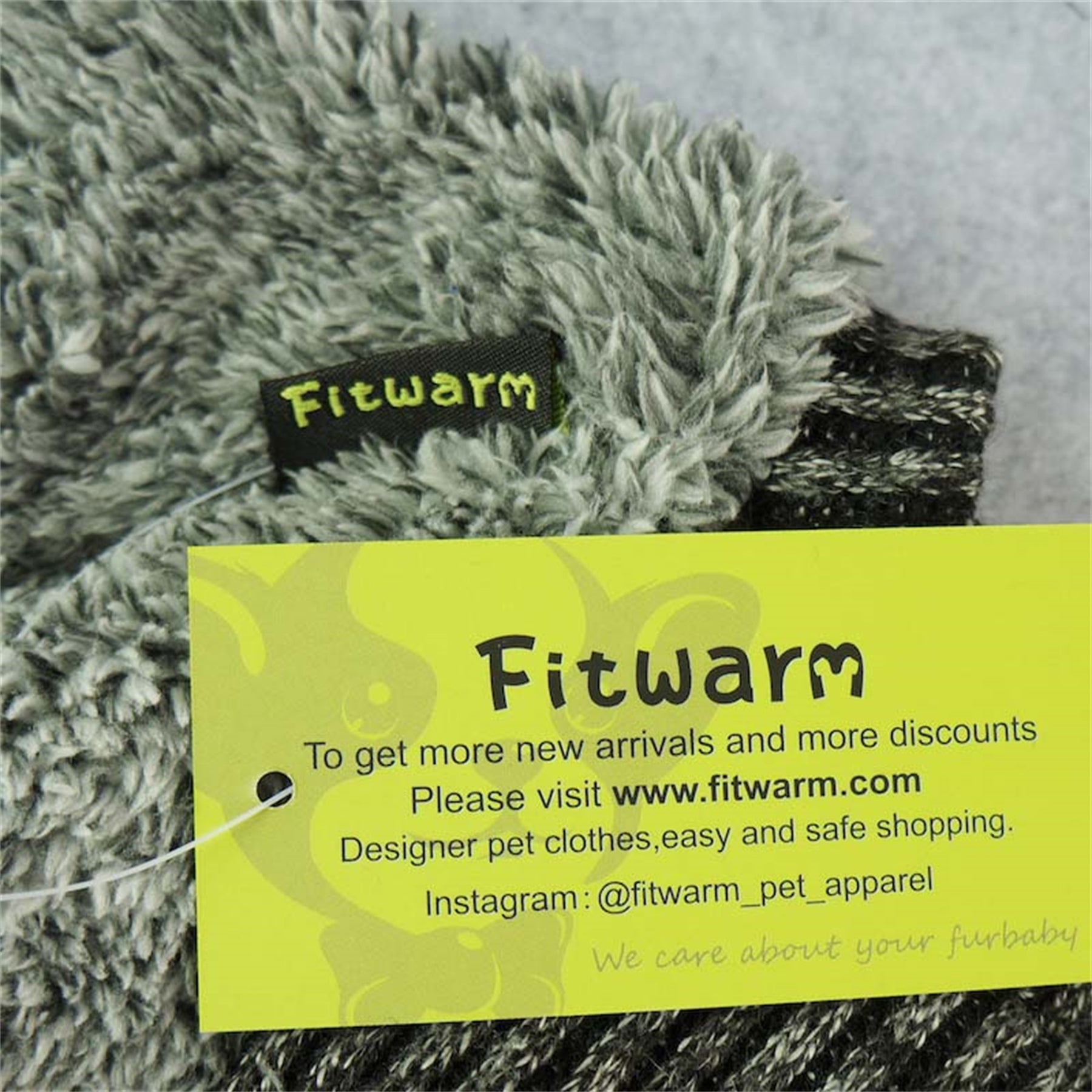 Close-up of a gray, fuzzy thermal dog pajama fabric with a Fitwarm brand tag and a yellow informational tag.