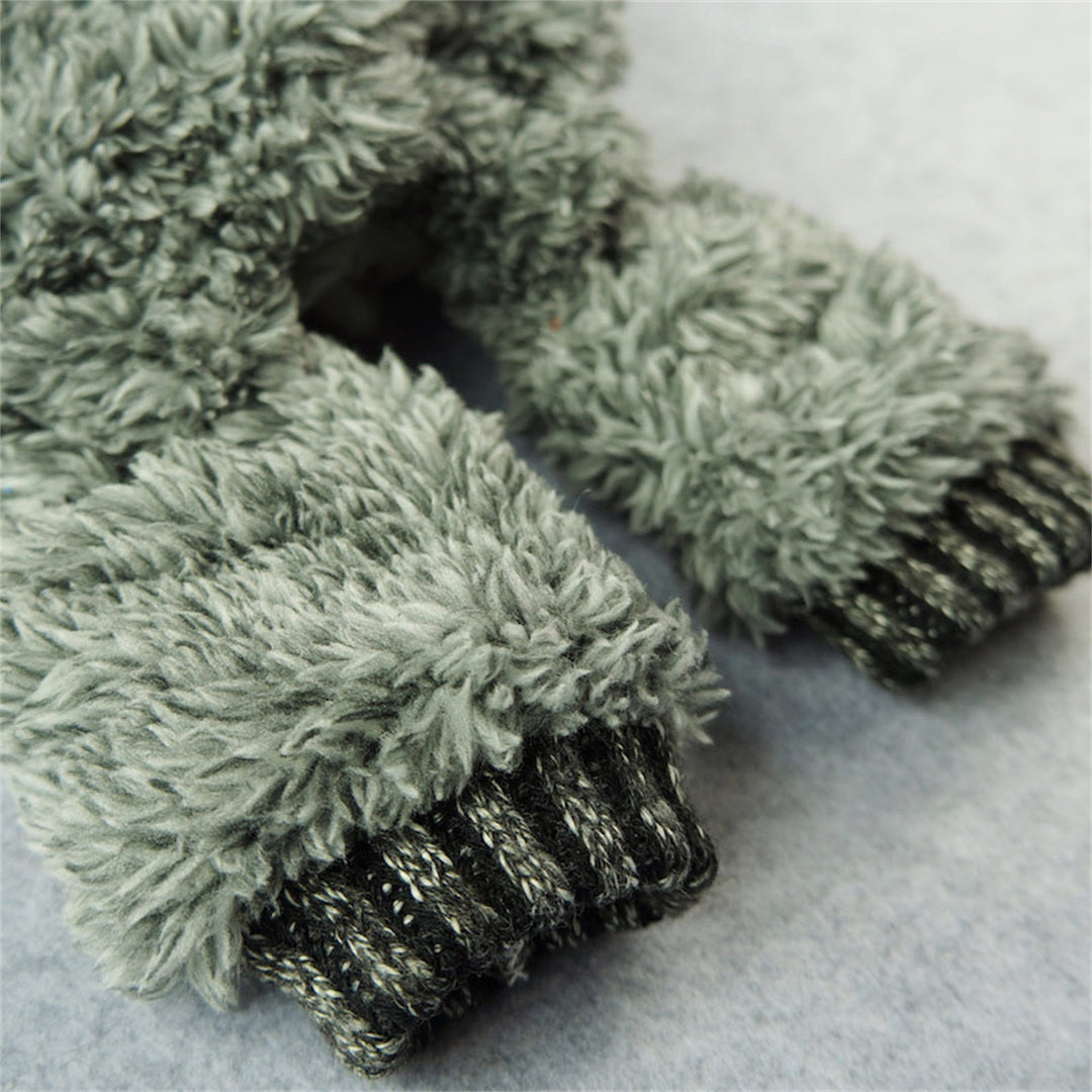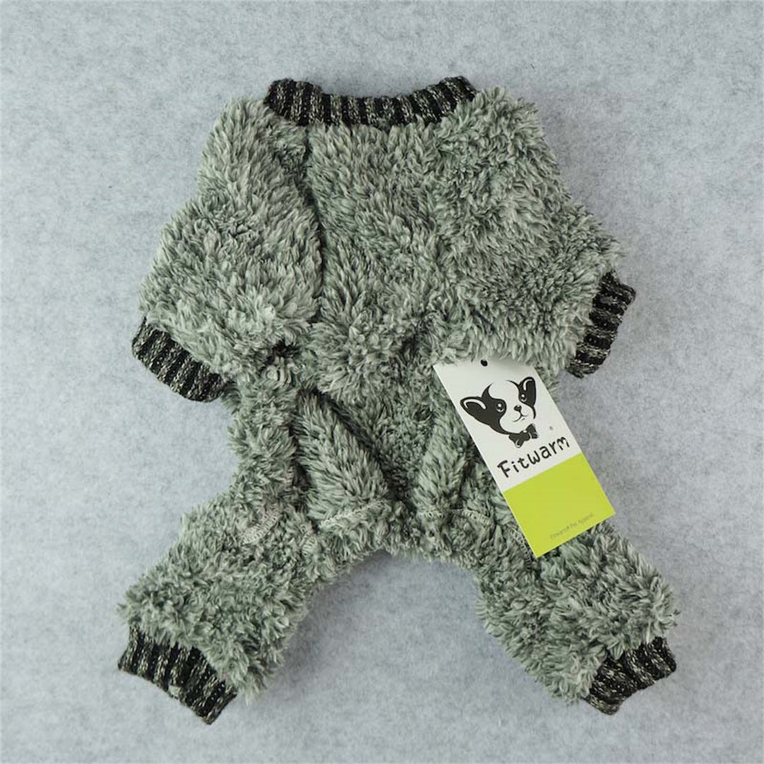 Grey fluffy thermal dog pajamas with ribbed collar and cuffs. Tag reads "Fitwarm".