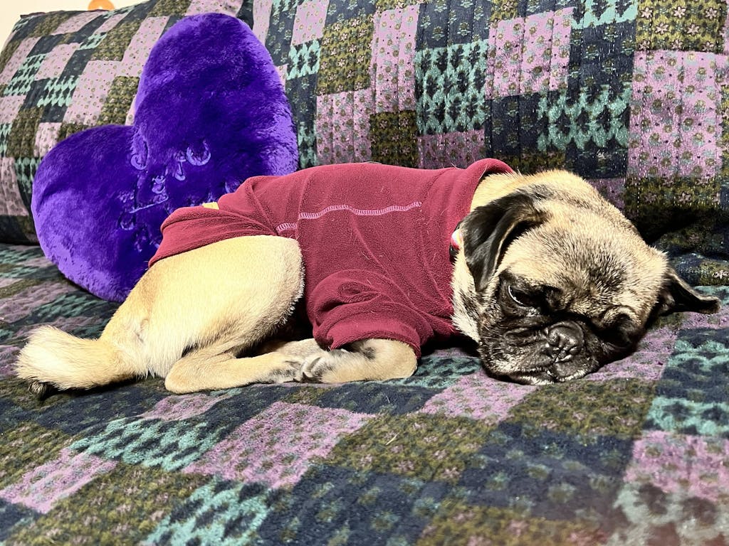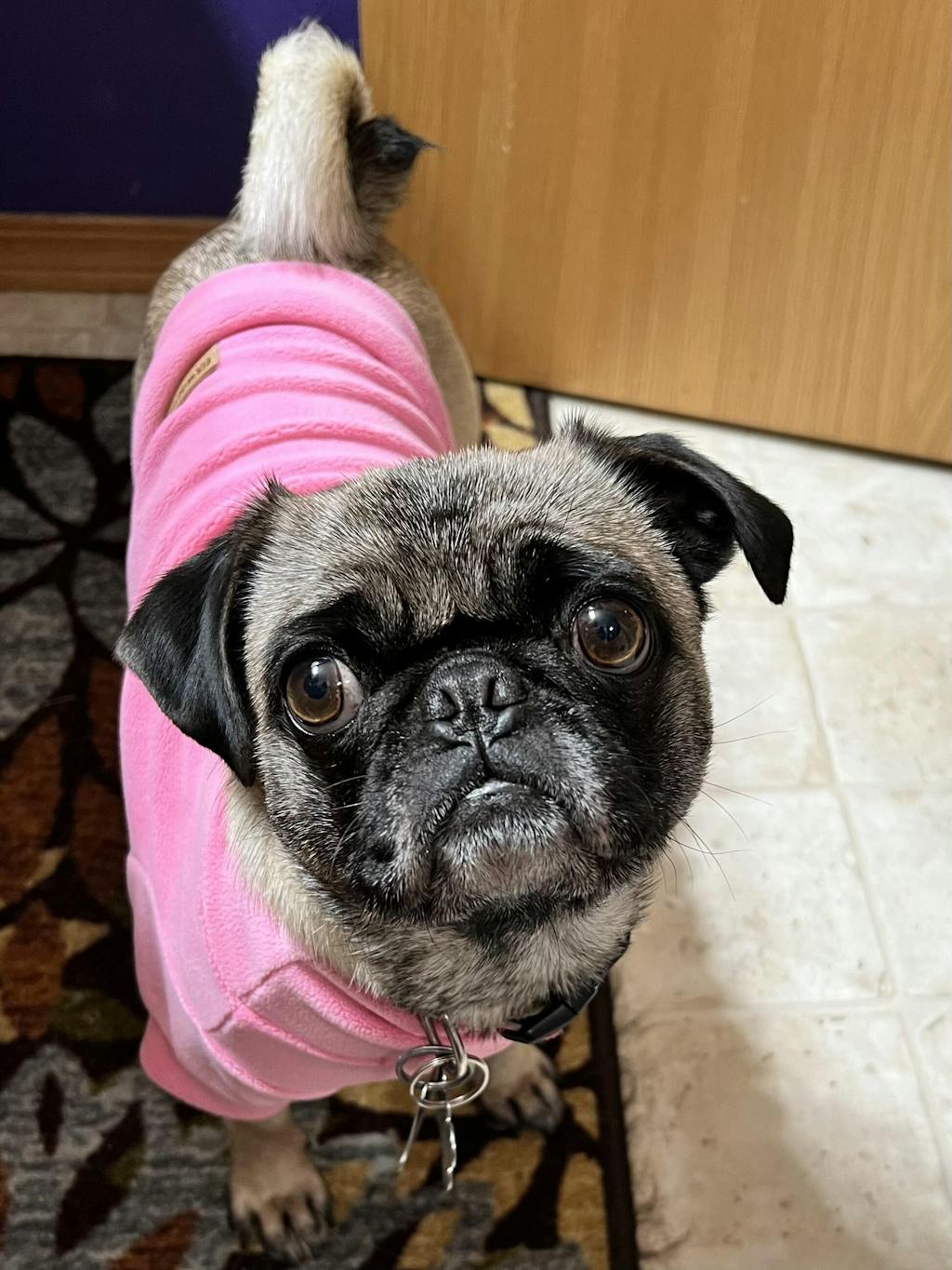 These turtleneck sweaters are amazing for my pugs! They are soft, warm and cozy. The size medium fits my two smaller 15-16 pound pugs perfectly! They wash and dry wonderfully. The material is soft and they have great stretch to them which means they are easy to put on and they don’t stretch out as your dog wears them. I love the fabric, which is a substantial weight, stretchy, velour, over fleece or knitted sweaters because amazingly the dog hair doesn’t get stuck all over them! I ordered the three pack of pink tones for my new girl and loved them so much that I went back and ordered the three pack of purple and the three pack of green!