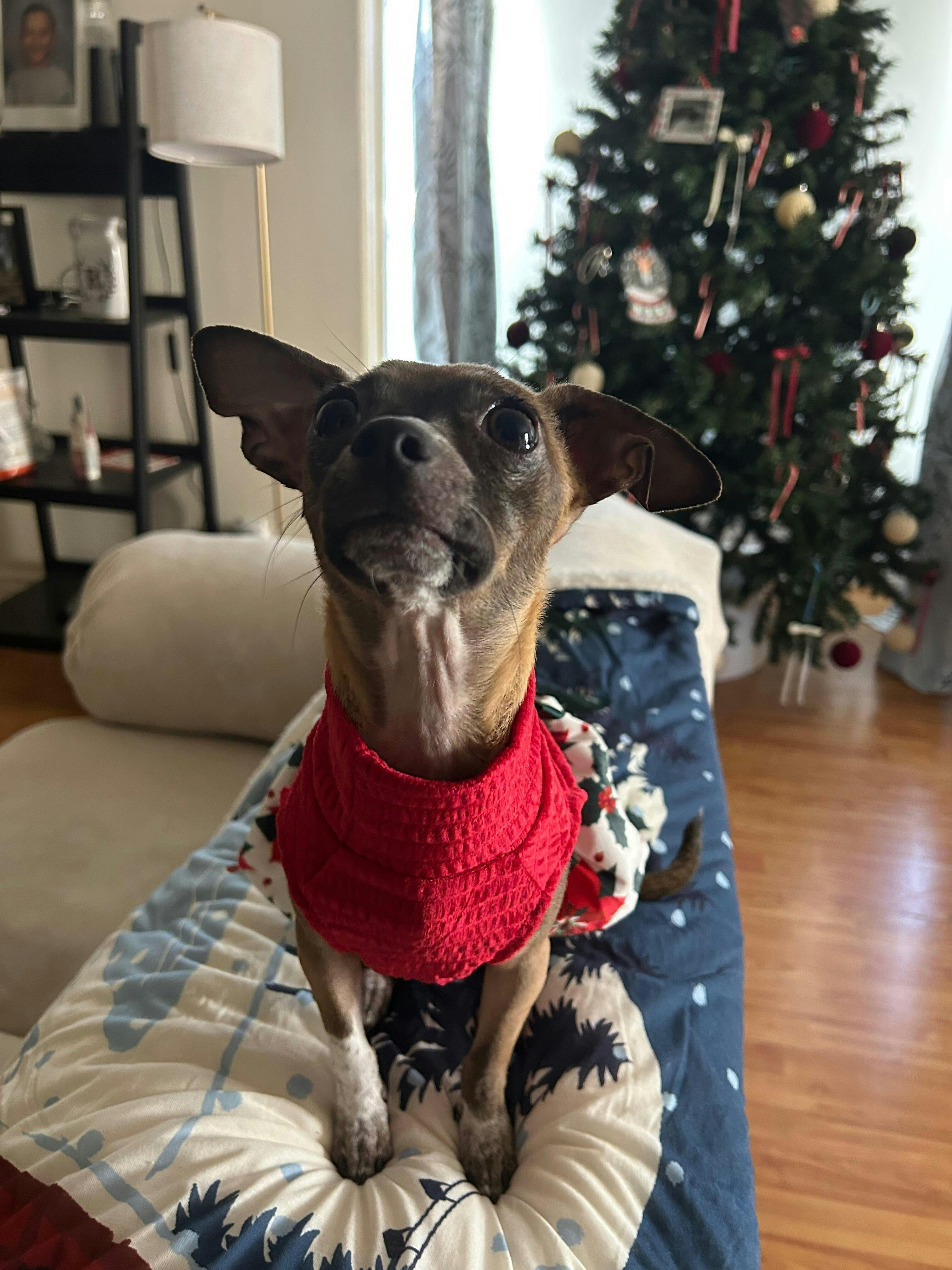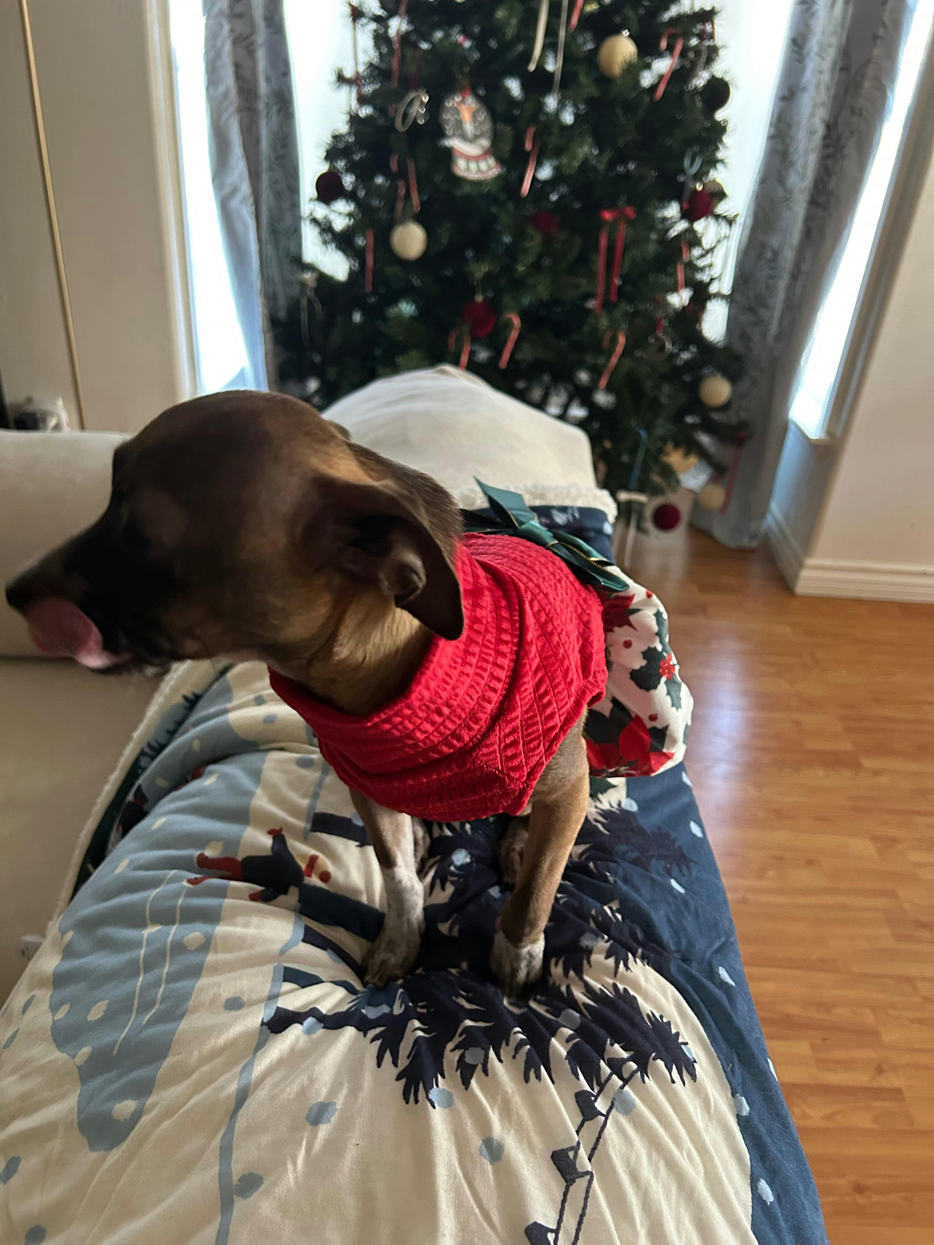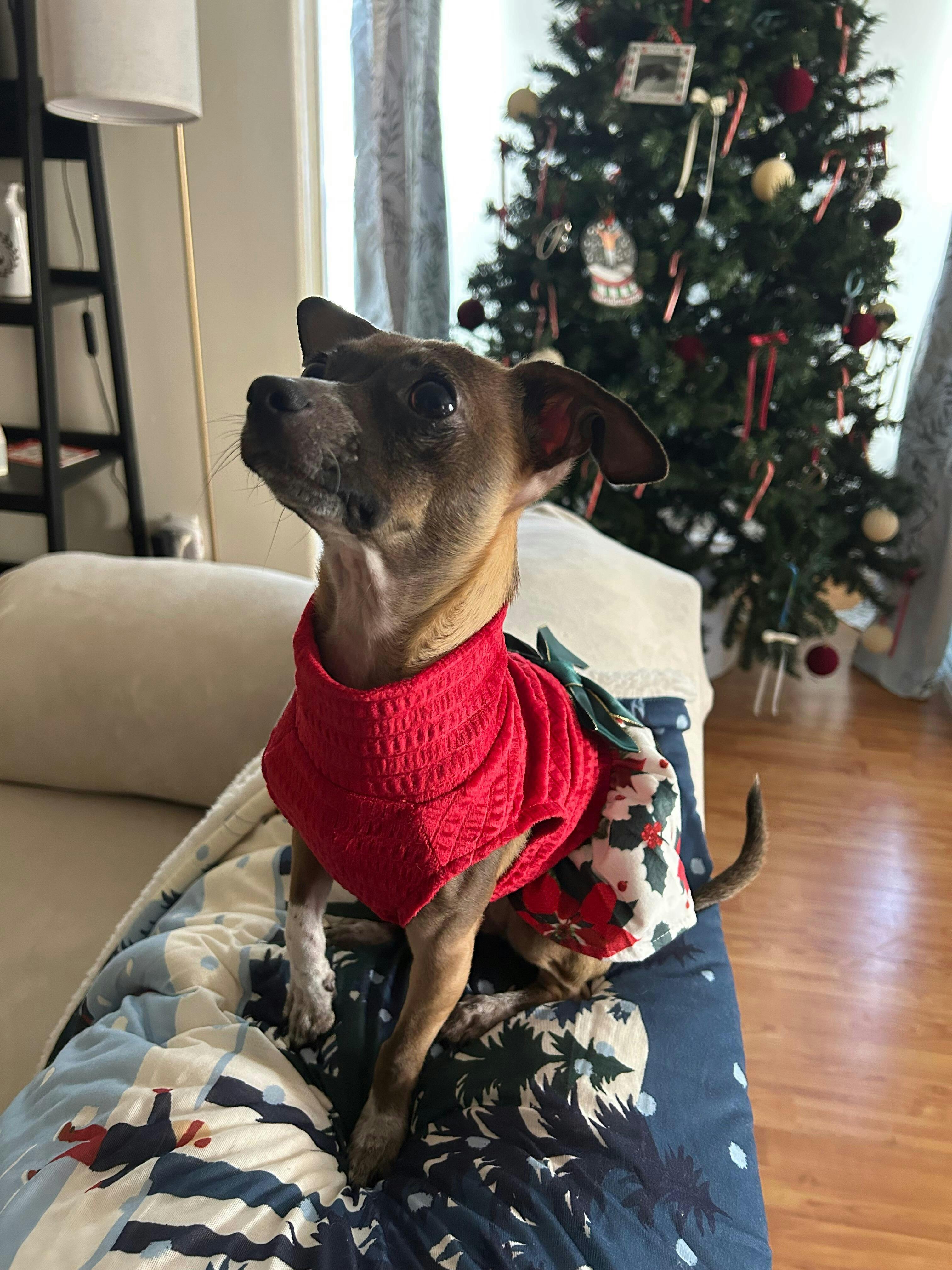 Small white dog in red Christmas dress with poinsettia print skirt and green bow.