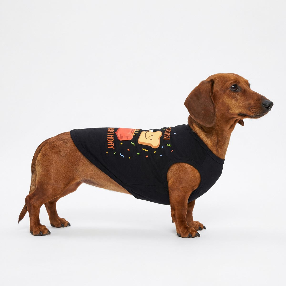 Black dog shirt with "A Toast to Your Birthday" graphic featuring cartoon toasts, confetti, and toaster.