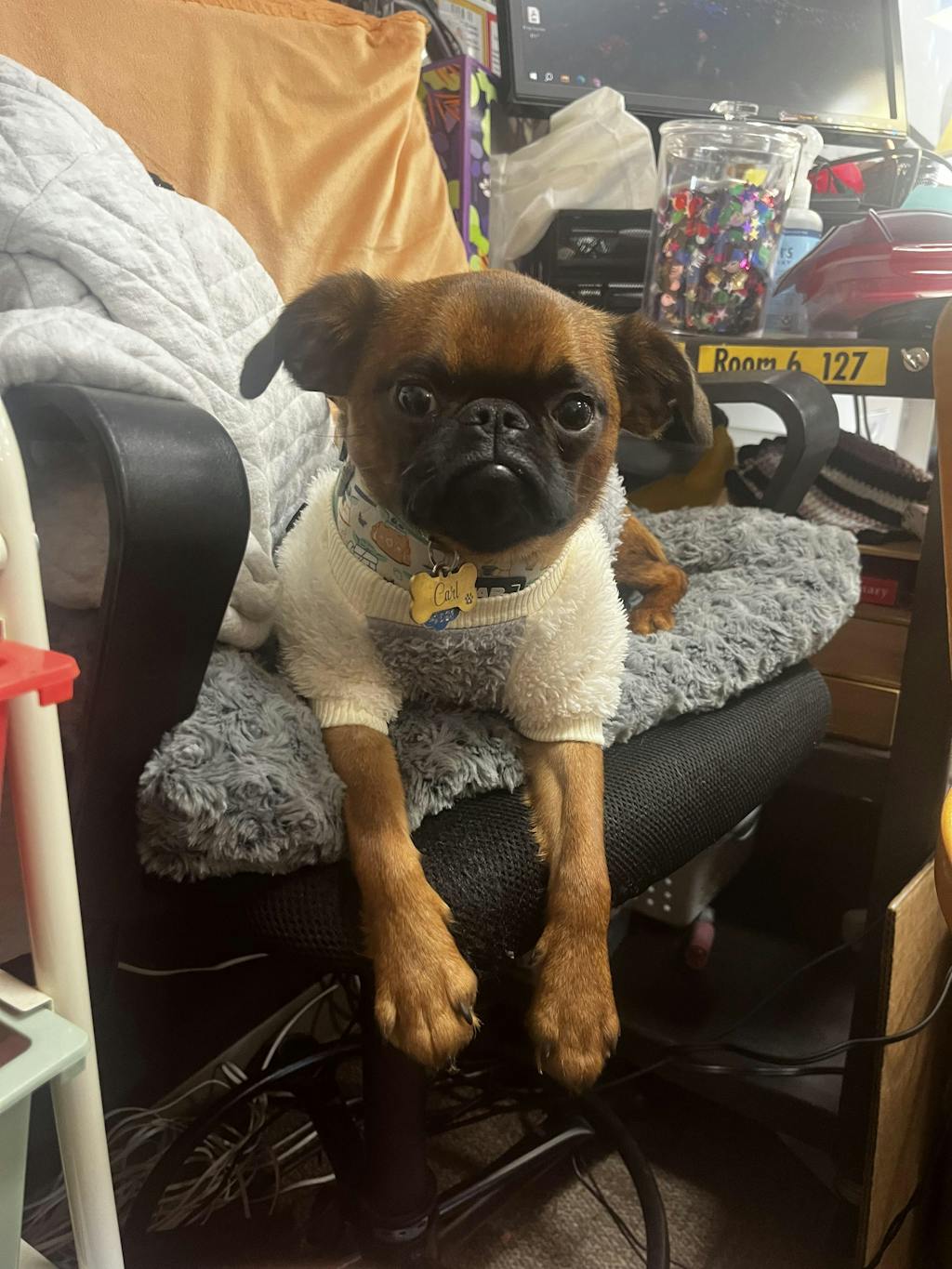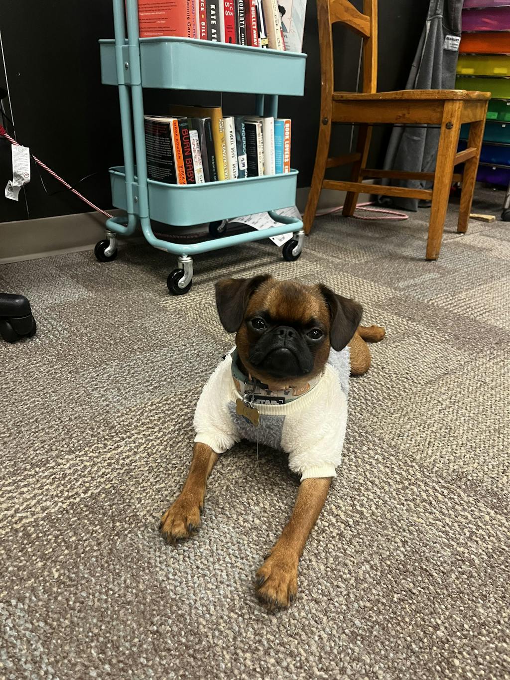 Chihuahua wearing a white fleece sweater with a brown heart accent, cozy fall and winter apparel.