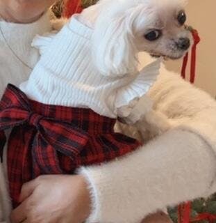 White knit dog sweater dress with red plaid skirt, ruffle sleeves, and bow. Soft, thermal, stretchy fabric.