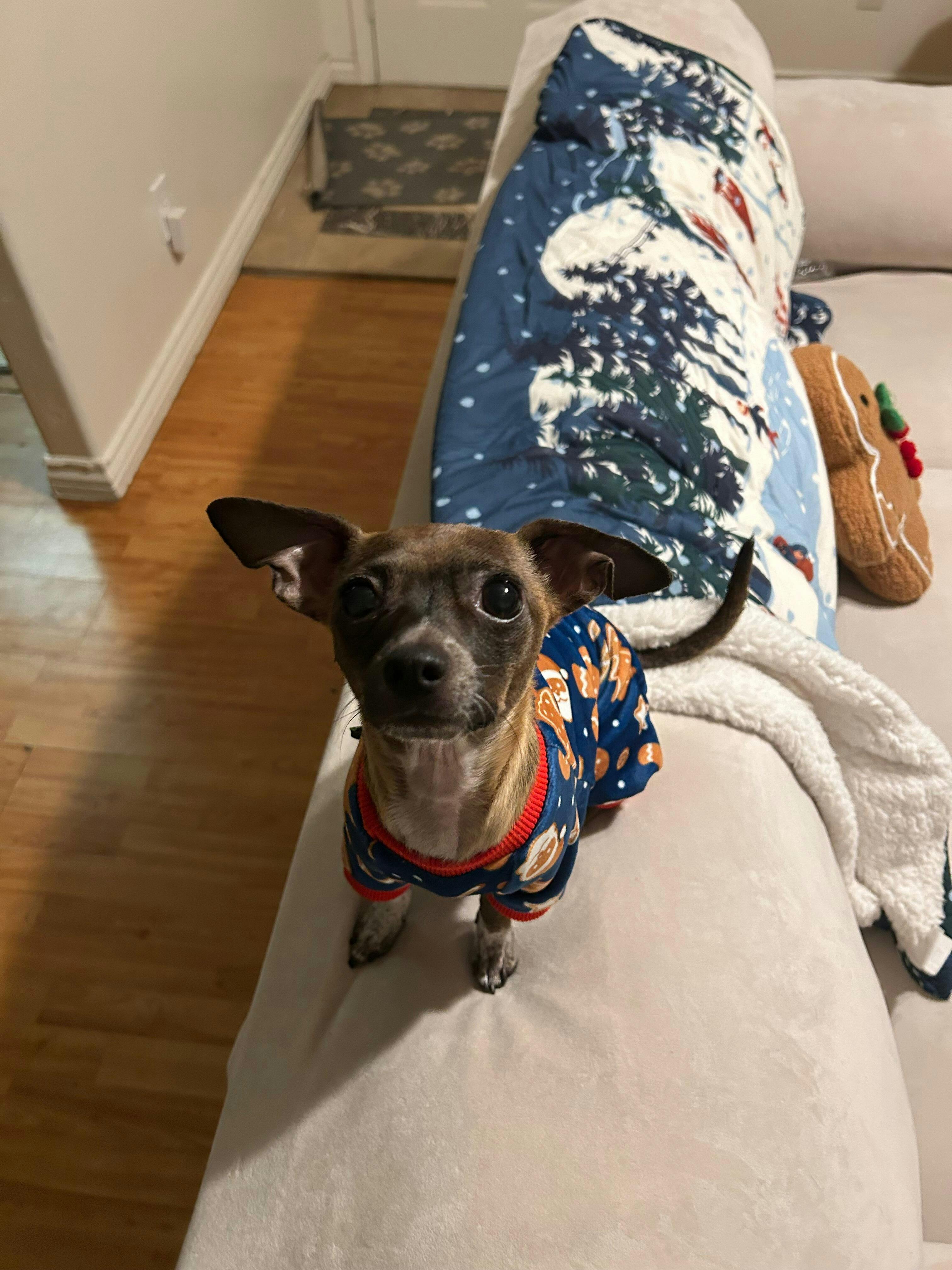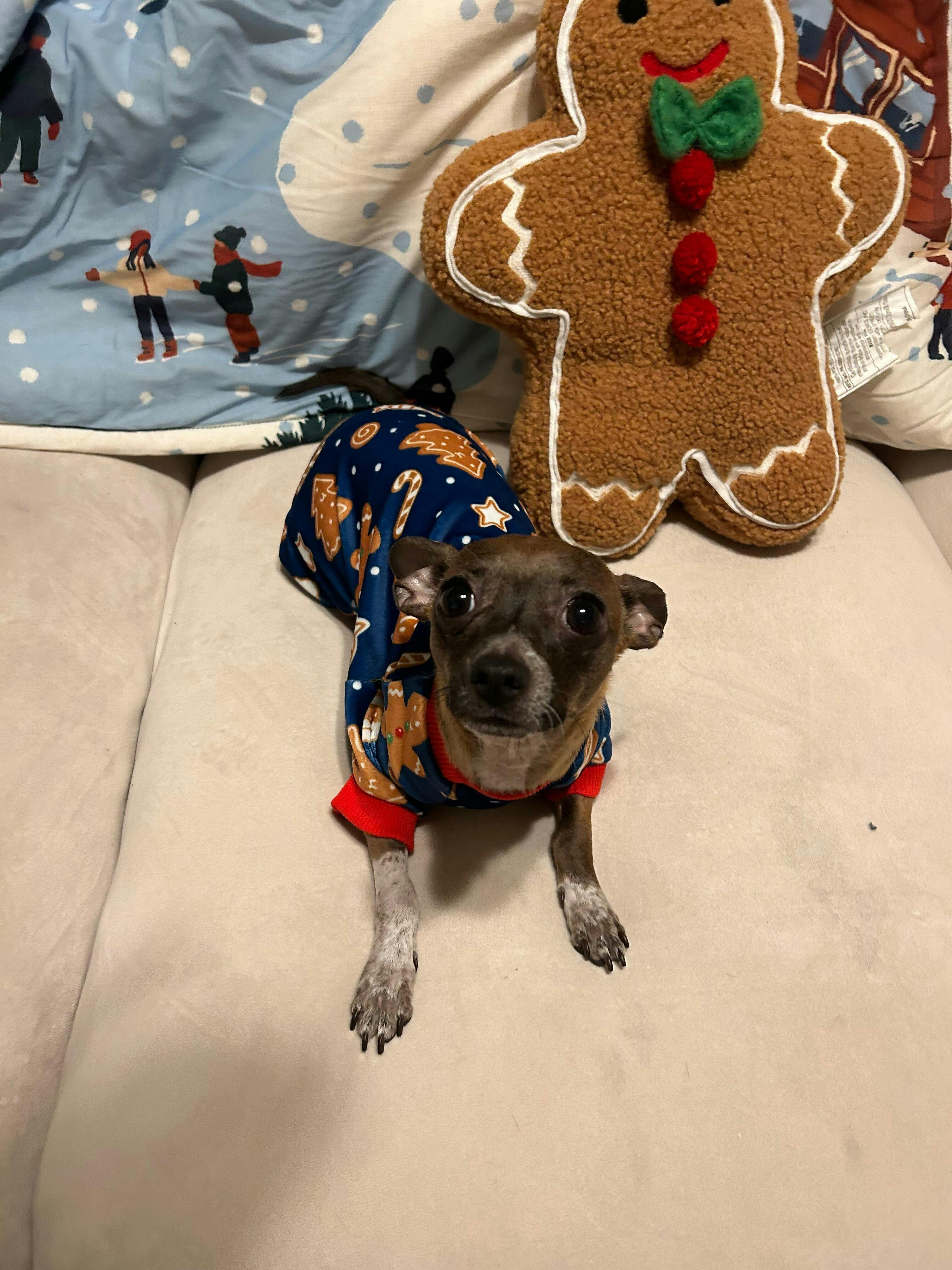Blue dog pajamas with gingerbread men, candy canes, and Christmas trees. Red cuffs.