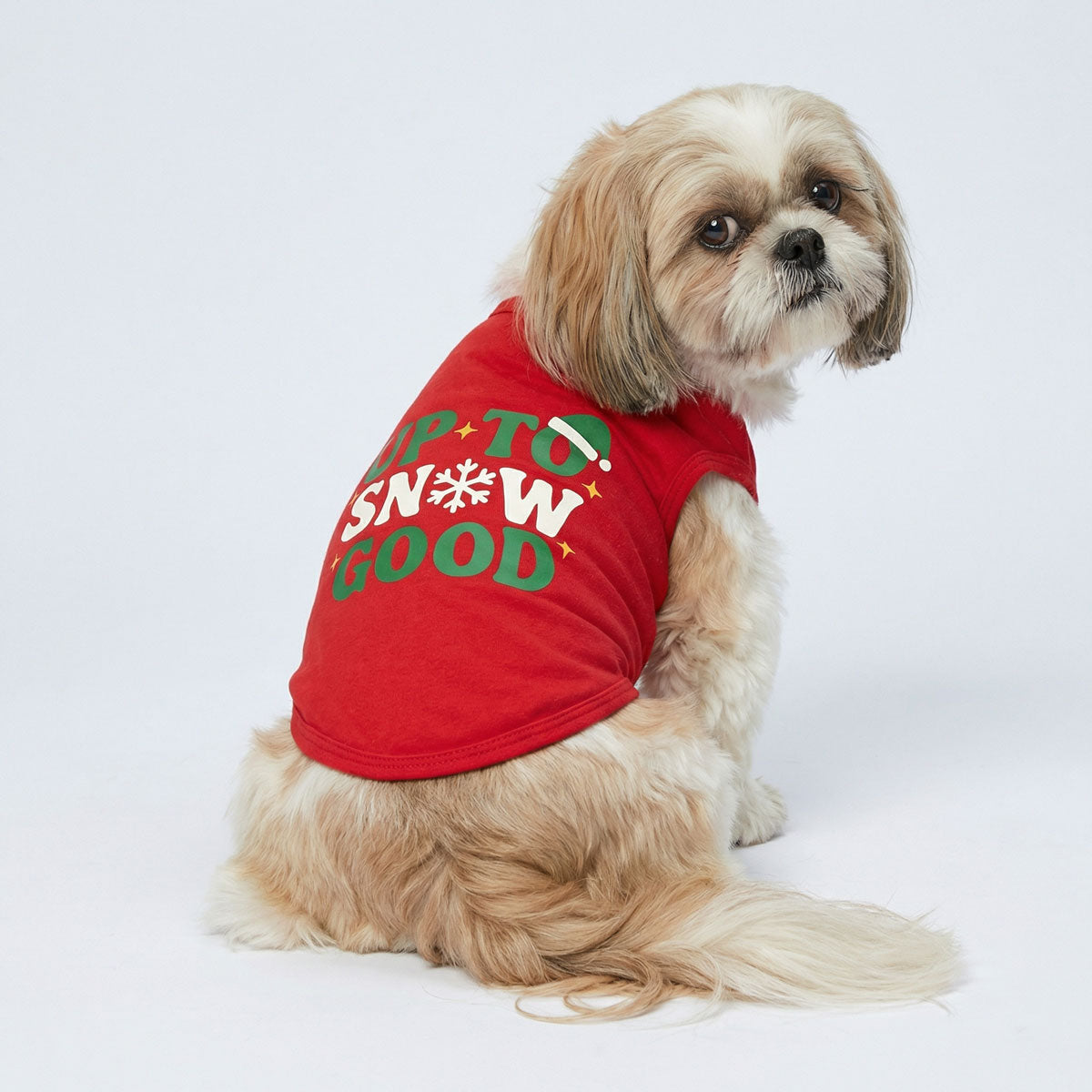 Red "Up to Snow Good" Christmas dog shirt with snowflake and Santa hat graphic. Cotton-blend for comfort.