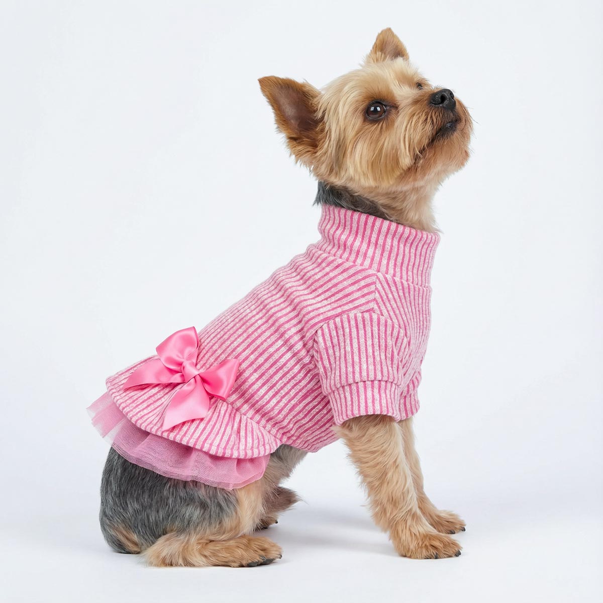 Pink striped turtleneck knitted dog dress with satin bow and tulle skirt.