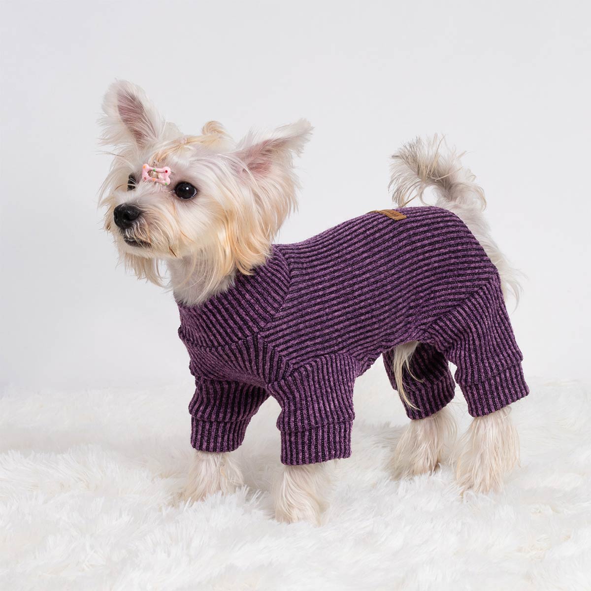 Adorable dog dressed in ribbed knitted dog onesie featuring a soft purple texture and snug fit