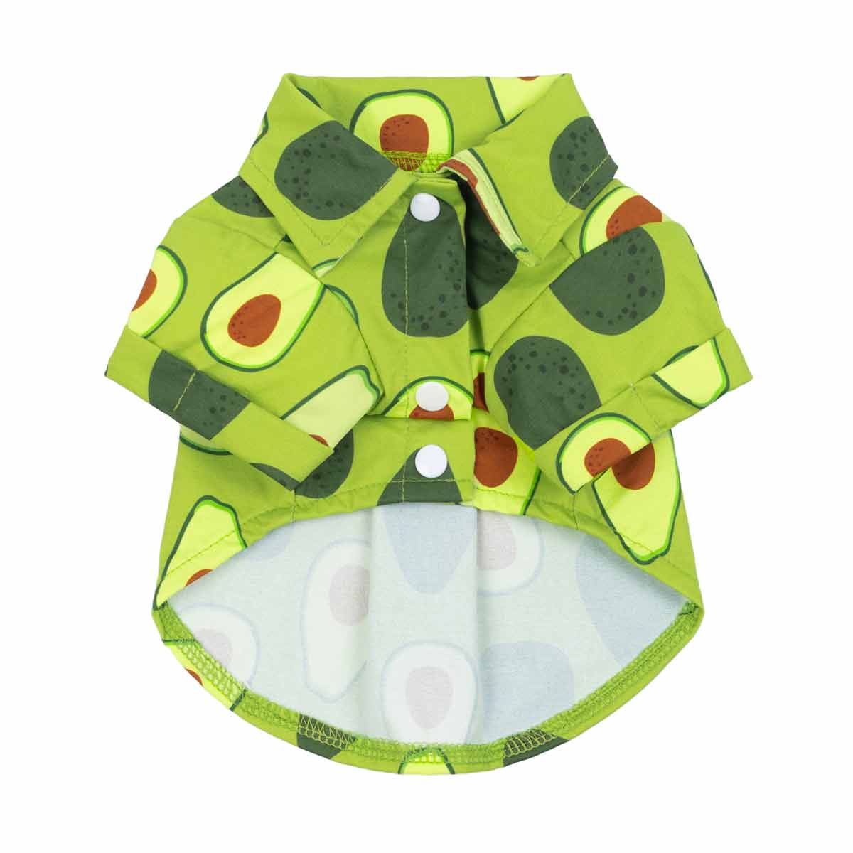 Dog modeling button-up dog shirt featuring playful avocado pattern
