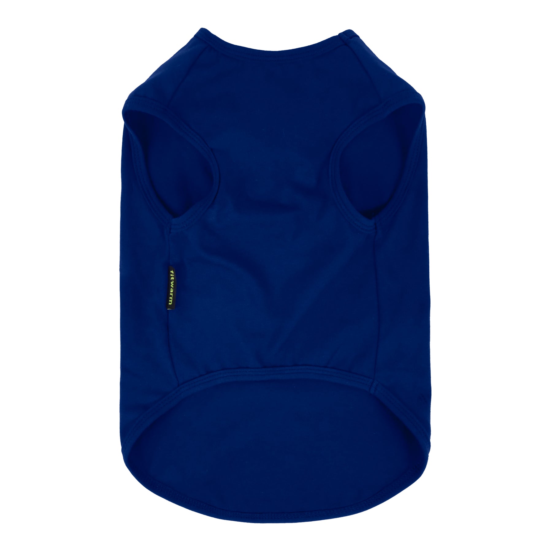Blue dog shirt, back view with sleeveless design and curved hem