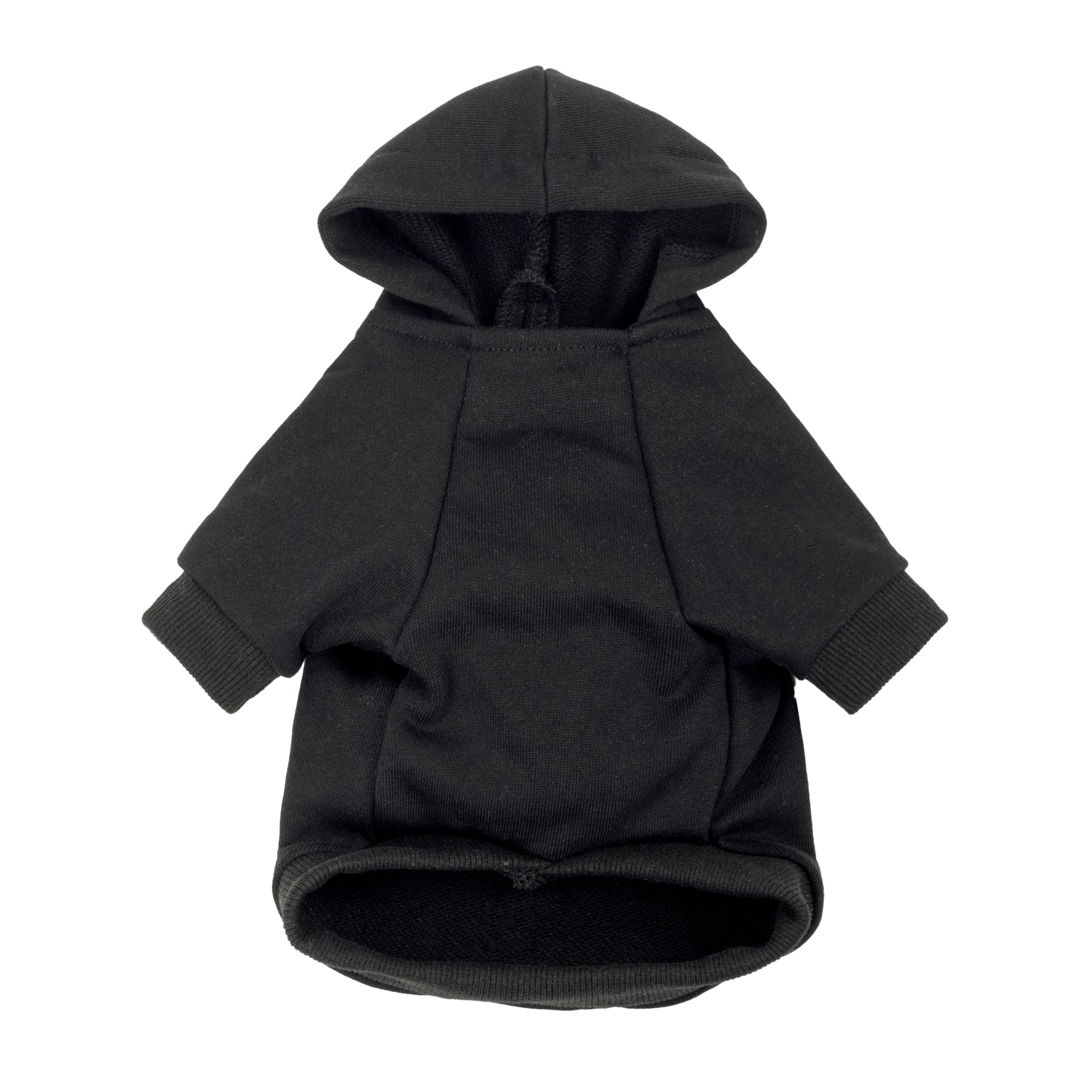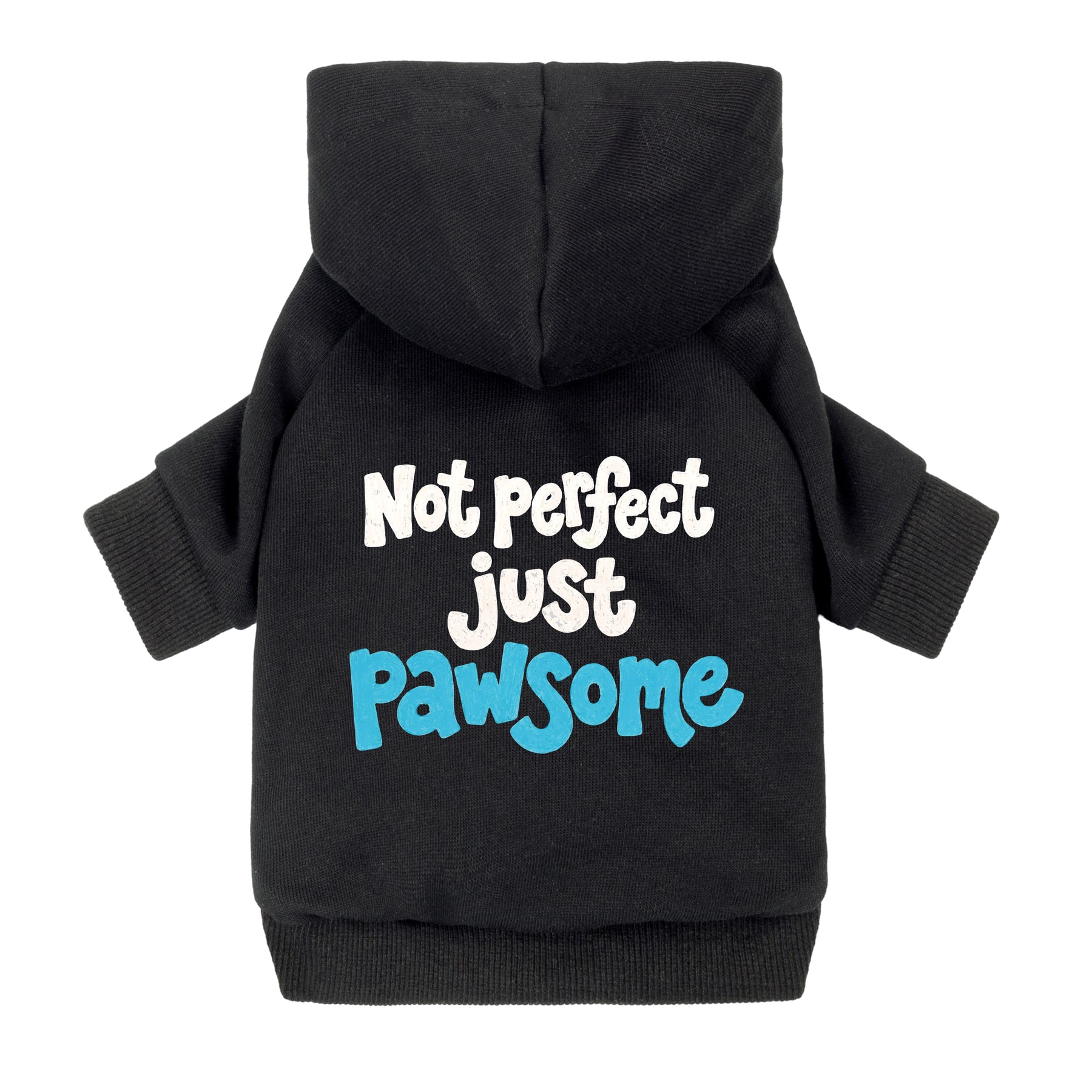 Black dog hoodie with “Not perfect just pawsome” print, back view