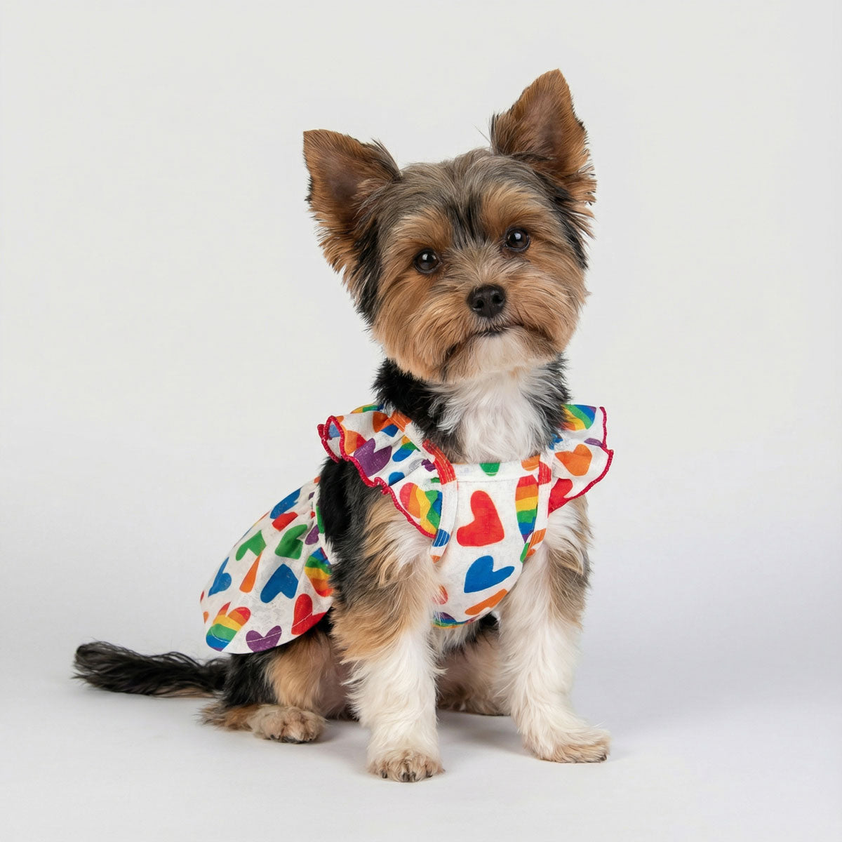 Yorkshire Terrier in Colorful Hearts Dog Dress with Ruffles. Rainbow heart print, perfect for small dogs. Fitwarm dress