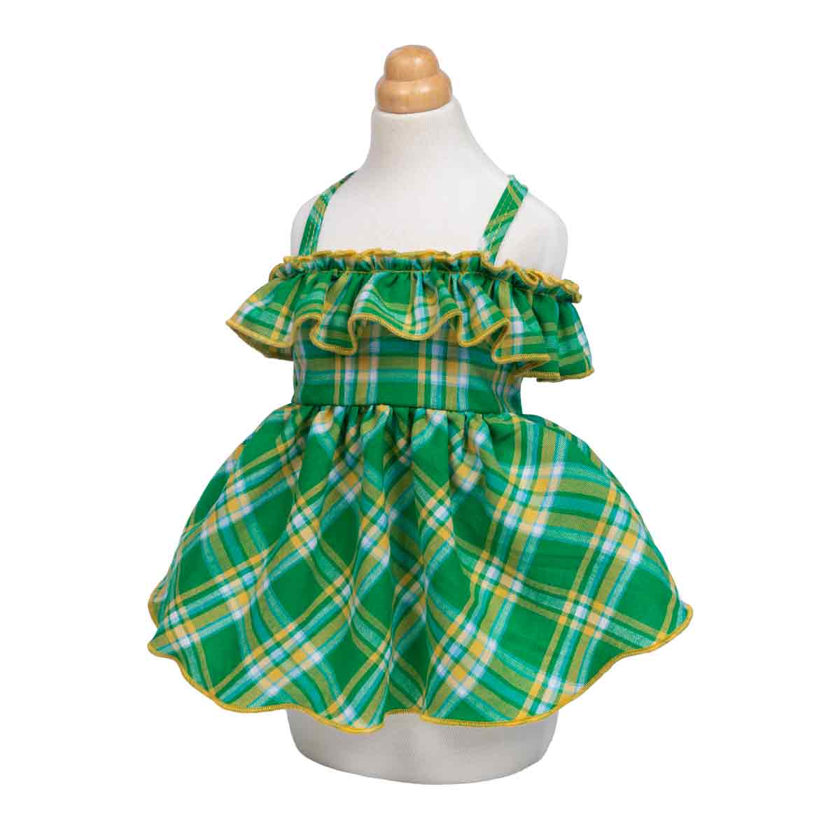 Dog dress with green plaid pattern, ruffled top, and adjustable straps.