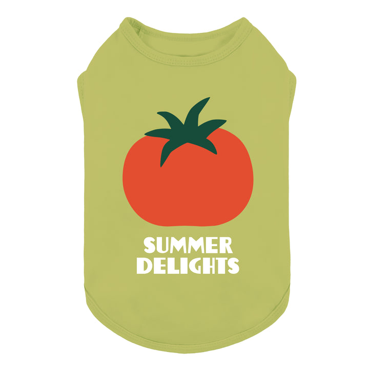 Juicy tomato graphic meets summer green for a playful twist on everyday dog outfits. Soft, lightweight fabric shapes the body in comfort, making it a cheerful pick for tail-wagging walks and backyard playtime. Bold letters reading “SUMMER DELIGHTS” add charm to one of the most eye-catching funny dog shirts. A breezy addition to dog tank tops that love color, simplicity, and smiles.