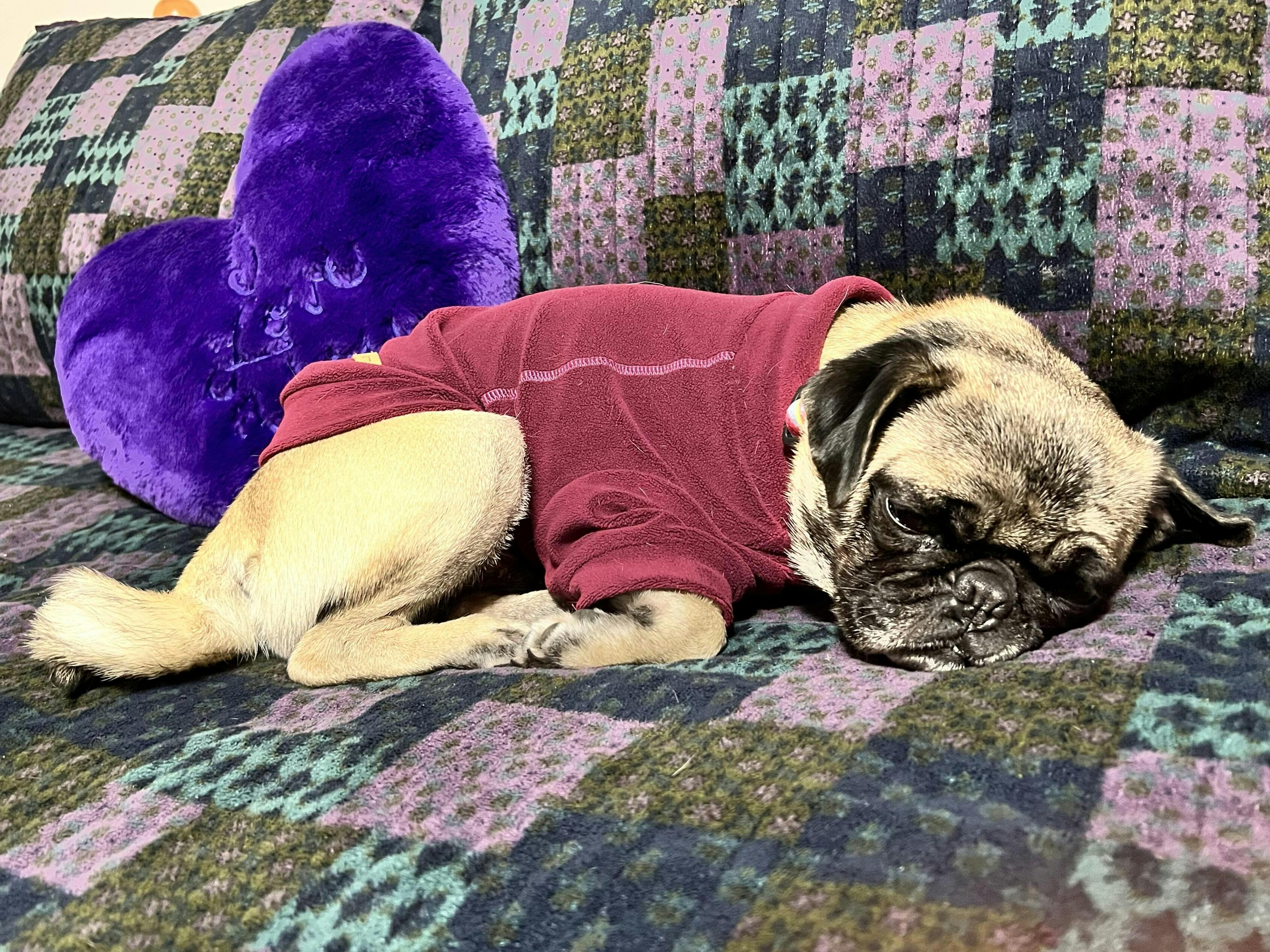 These turtleneck sweaters are amazing for my pugs! They are soft, warm and cozy. The size medium fits my two smaller 15-16 pound pugs perfectly! They wash and dry wonderfully. The material is soft and they have great stretch to them which means they are easy to put on and they don’t stretch out as your dog wears them. I love the fabric, which is a substantial weight, stretchy, velour, over fleece or knitted sweaters because amazingly the dog hair doesn’t get stuck all over them! I ordered the three pack of pink tones for my new girl and loved them so much that I went back and ordered the three pack of purple and the three pack of green!
