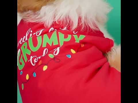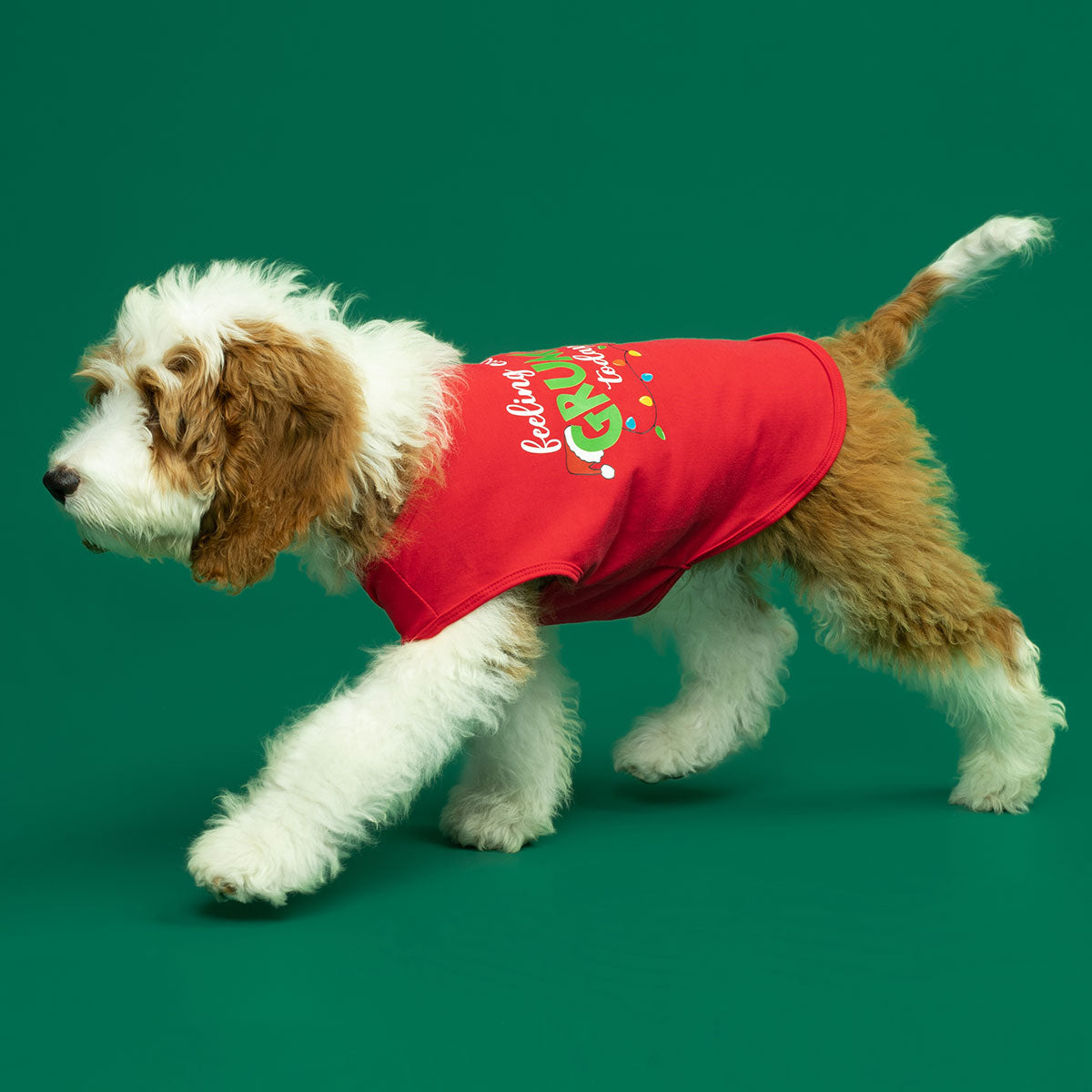 Red dog shirt with 'Feeling Extra Grumpy Today' text and festive Christmas lights. Comfortable holiday dog apparel.
