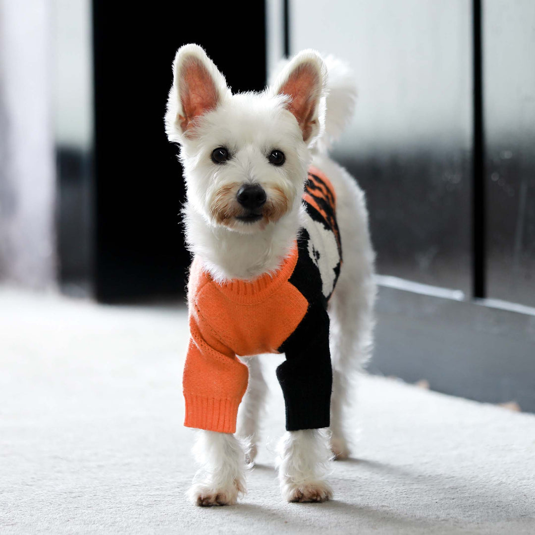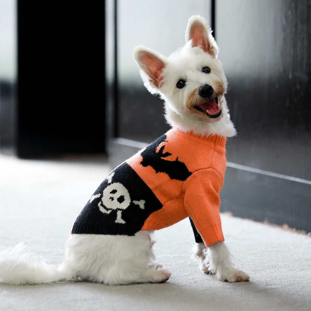 White dog wearing an orange and black Halloween dog sweater with skull and pumpkin print. Perfect for festive occasions.