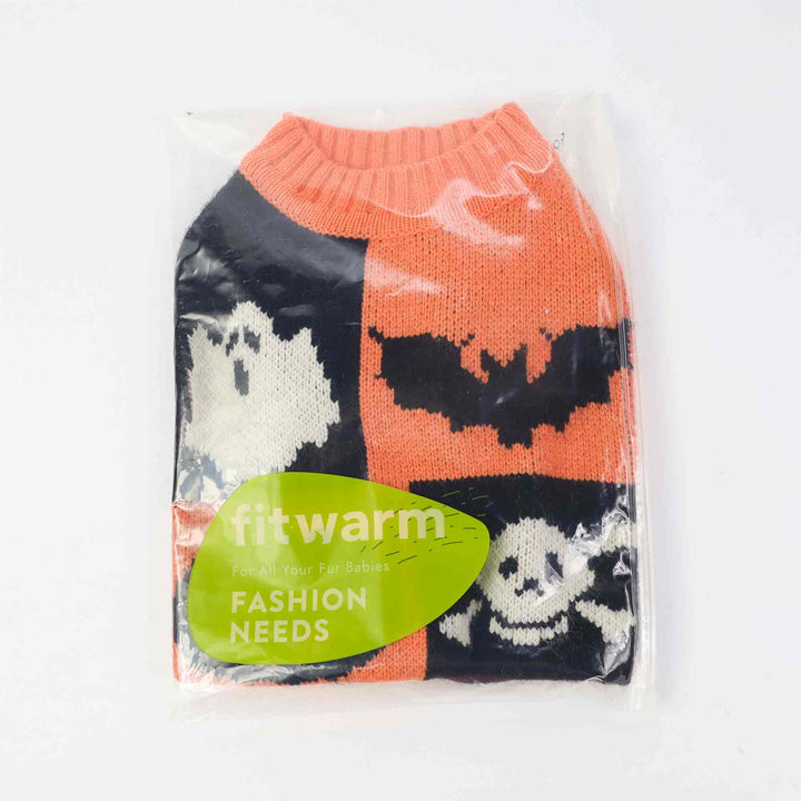 Orange and black Halloween dog sweater with ghosts, bats, and skull prints, packaged for product display.