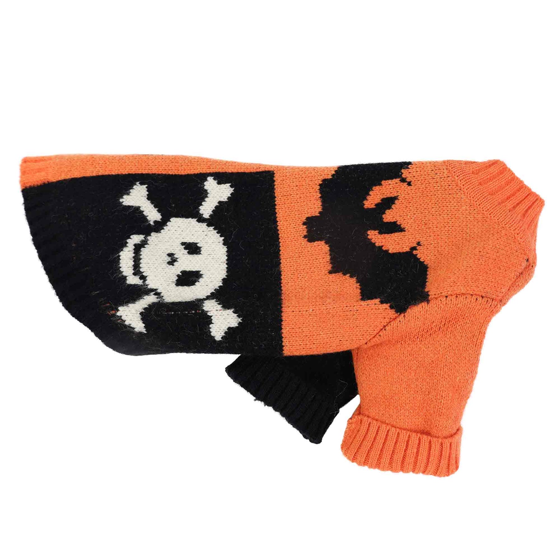 Orange and black Halloween dog sweater with skull and crossbones and bat graphic. Product appearance.