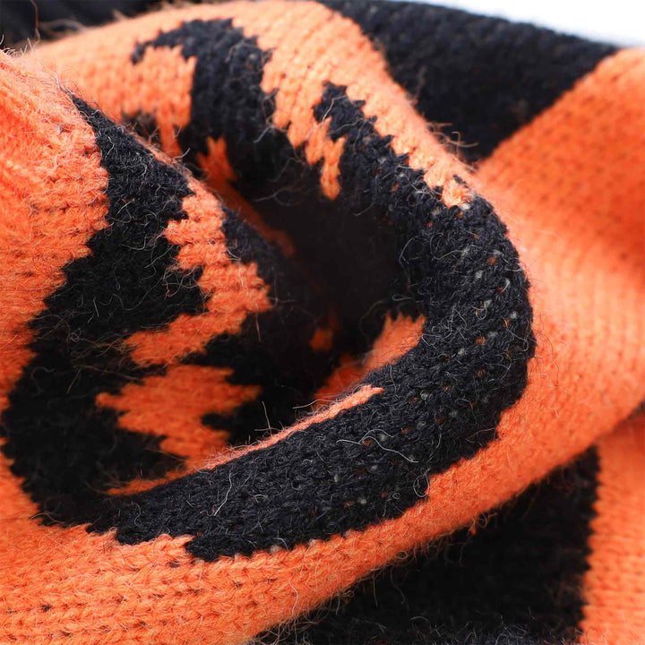 Close-up of a cozy Halloween dog sweater with orange and black ghost pattern, showcasing knit texture.