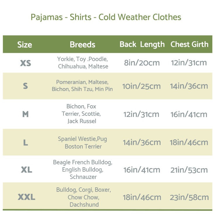Dog Clothes Size Chart - Pajamas, Shirts, and Cold Weather Clothes