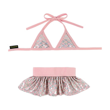 Pink dog bikini top with holographic mermaid scale print and tie straps.