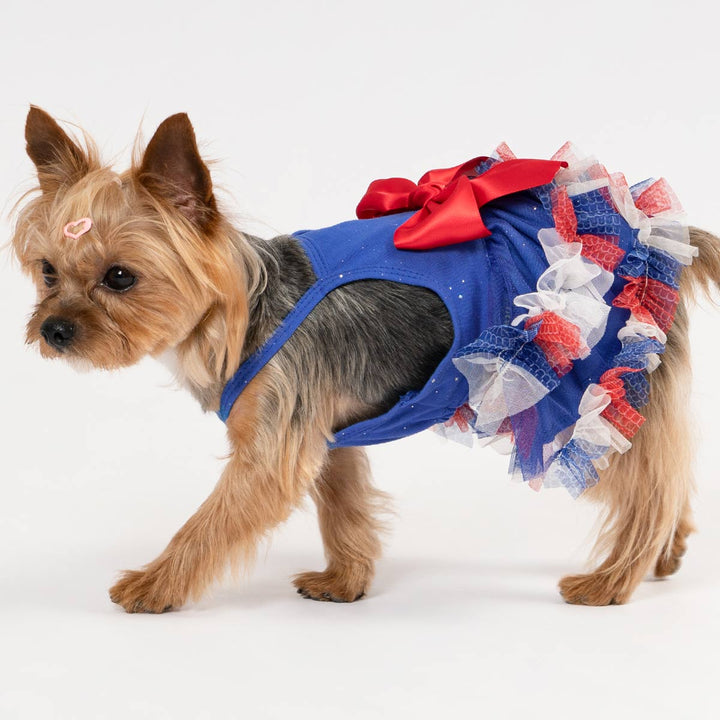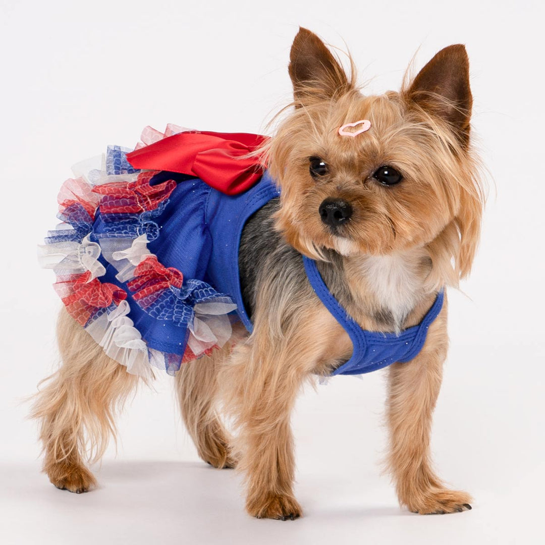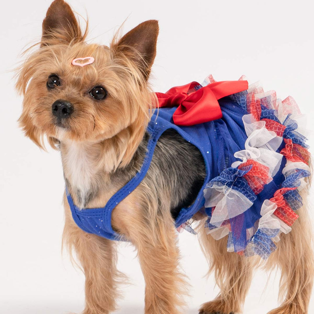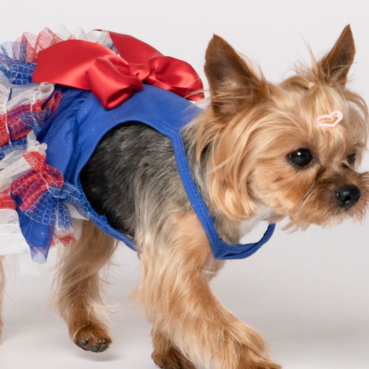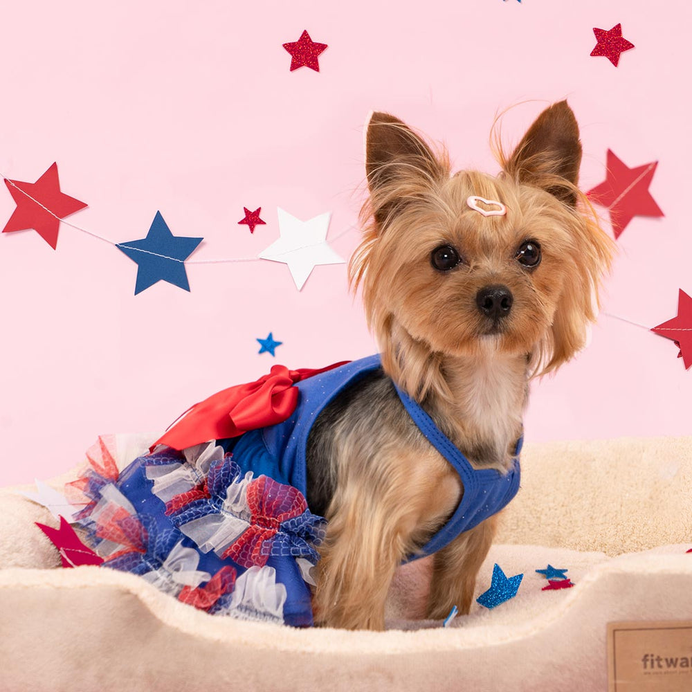 Patriotic dog tutu dress in blue with red and white accents, ideal for 4th of July