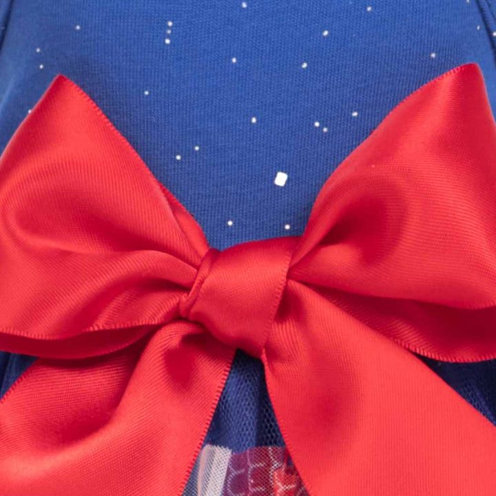 Patriotic dog tutu dress detail: red satin bow on blue bodice with white stars, ideal 4th of July.