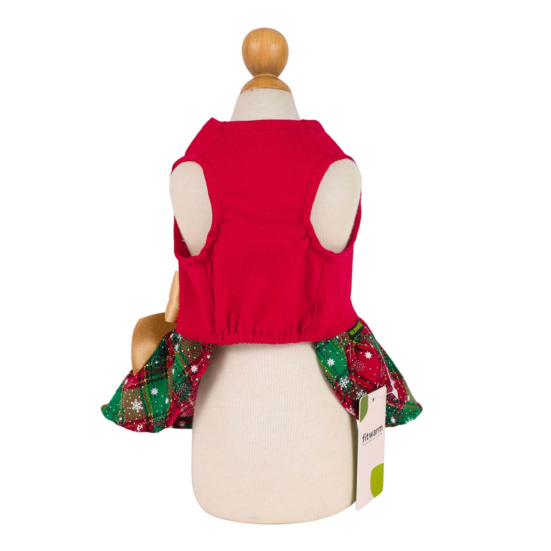 Back view of Woofmas Christmas dog dress: red top, green plaid skirt with snowflakes, and gold bow detail.