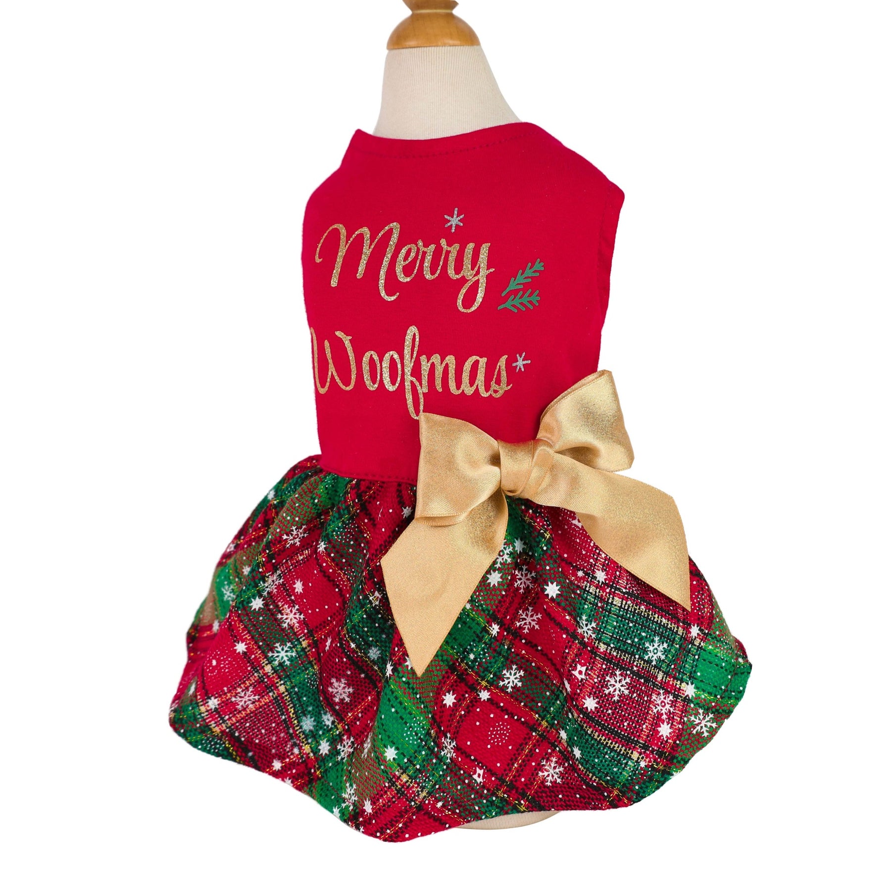 Woofmas Christmas dog dress in red with gold glitter text, plaid skirt, and large gold bow.